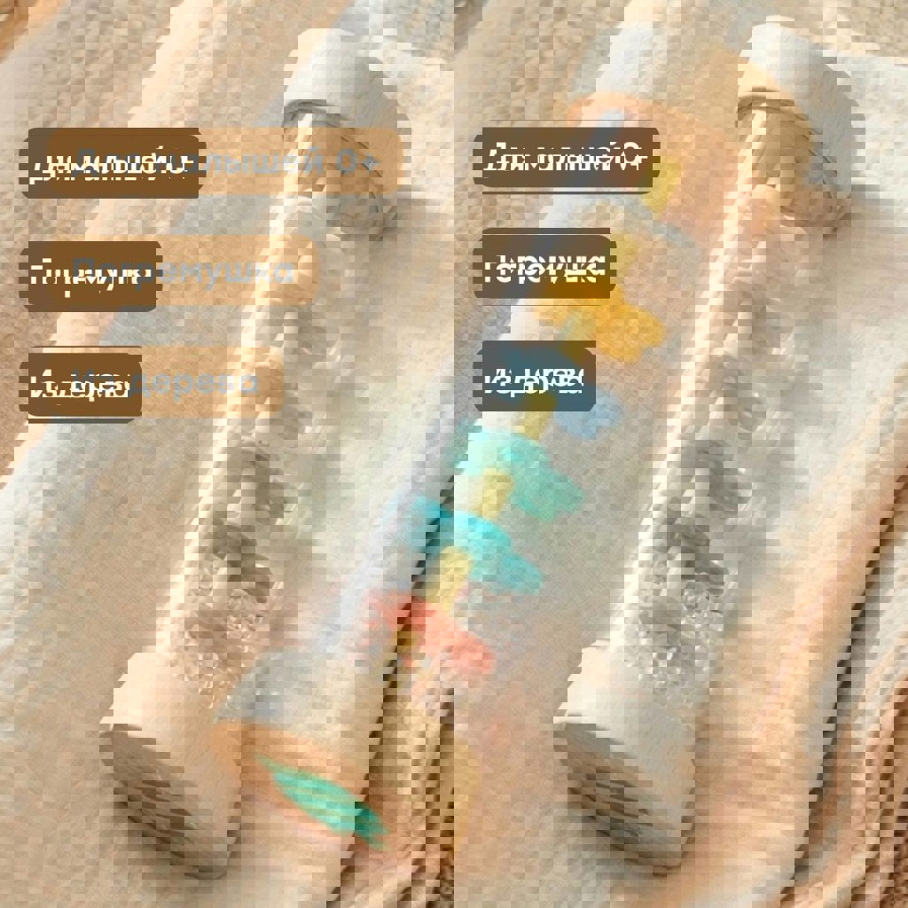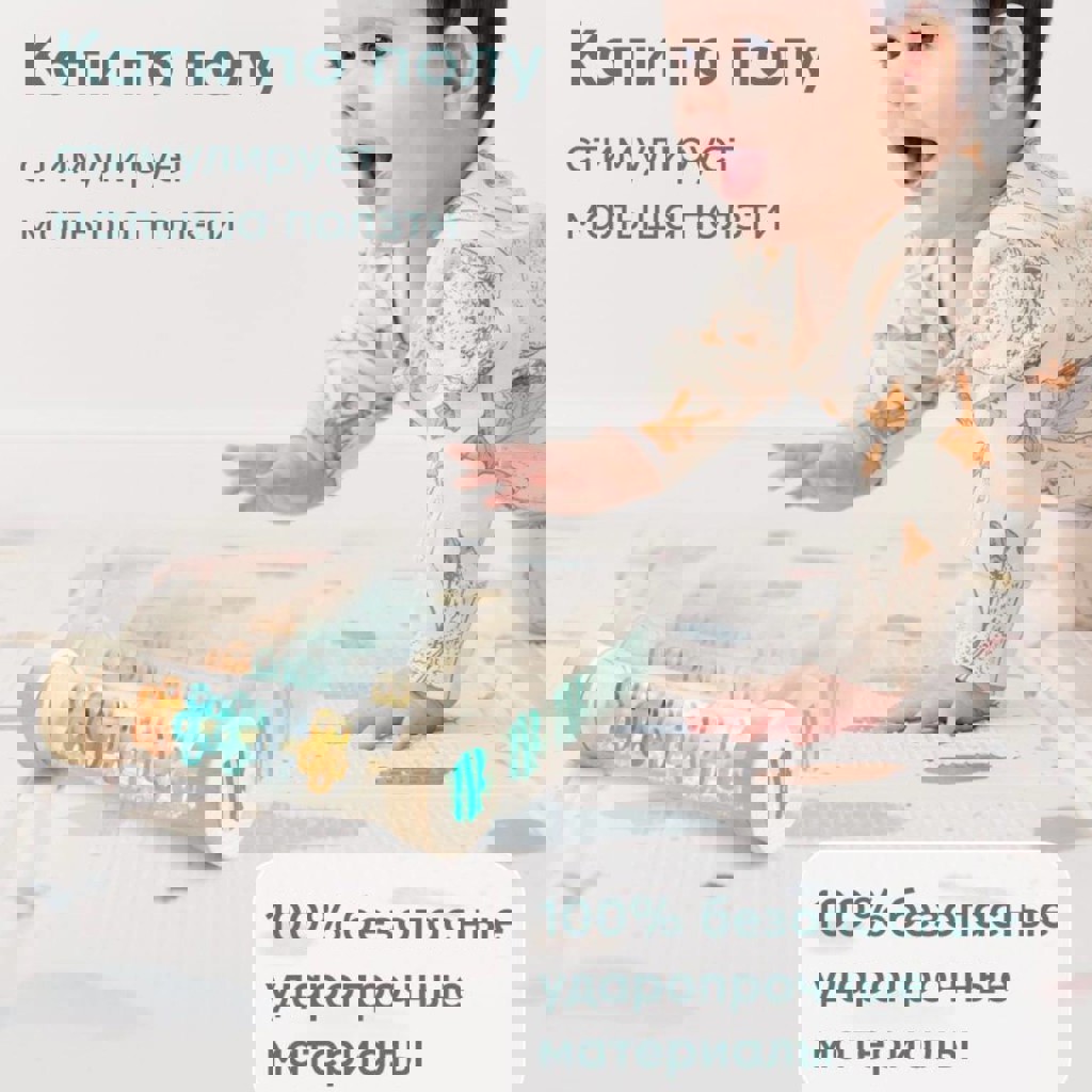 Катится по полу, стимулирует малыша ползти. Внутри шарики — приятно шумит и привлекает внимание. Дерево + безопасный пластик.