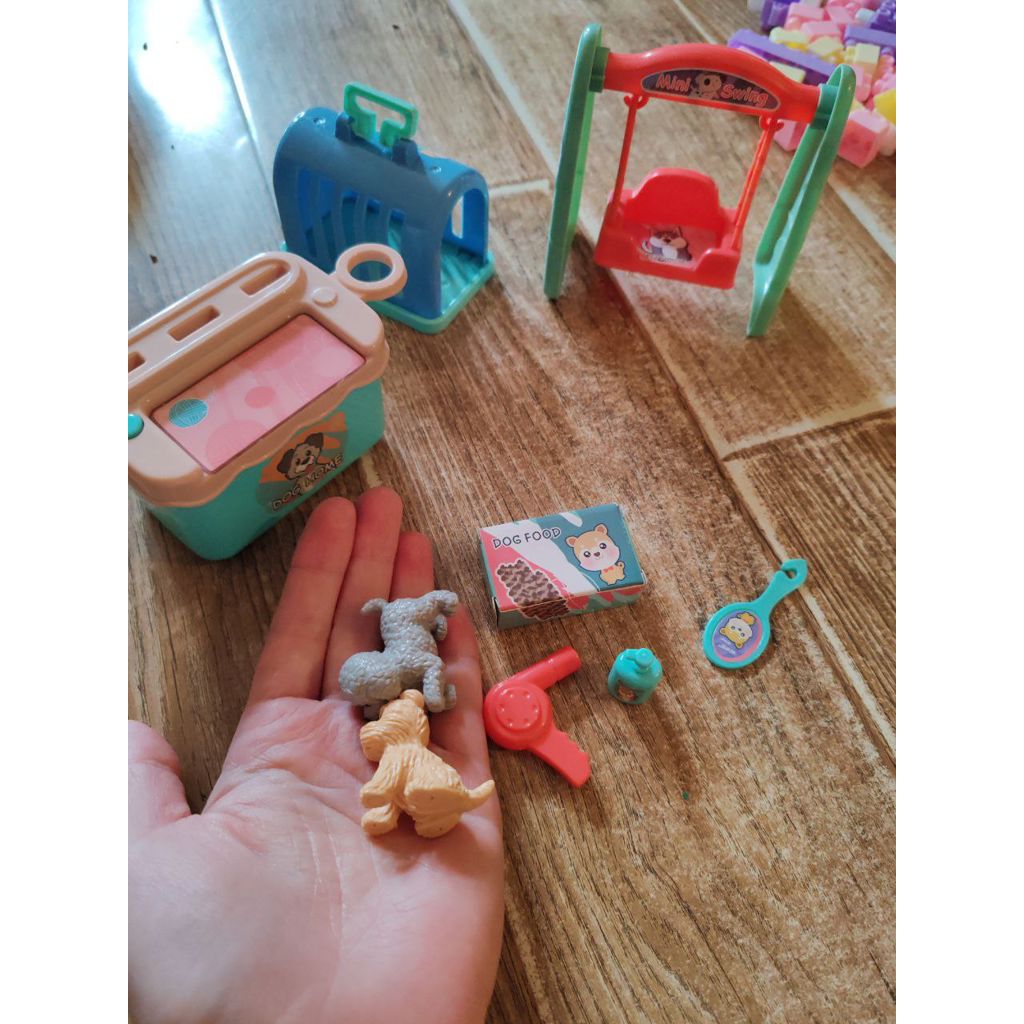 1. Мелкоформатный набор для игры в грумера: две собачки, переноска, стол для процедур, расчёска, зеркало, шампунь, корм, качели