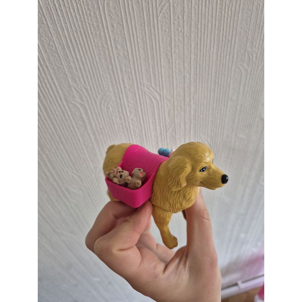 Мама собака с тремя щенками, которых она при наклоне лап рождает из живота, соска и бутылочка. Куколка в комплекте.