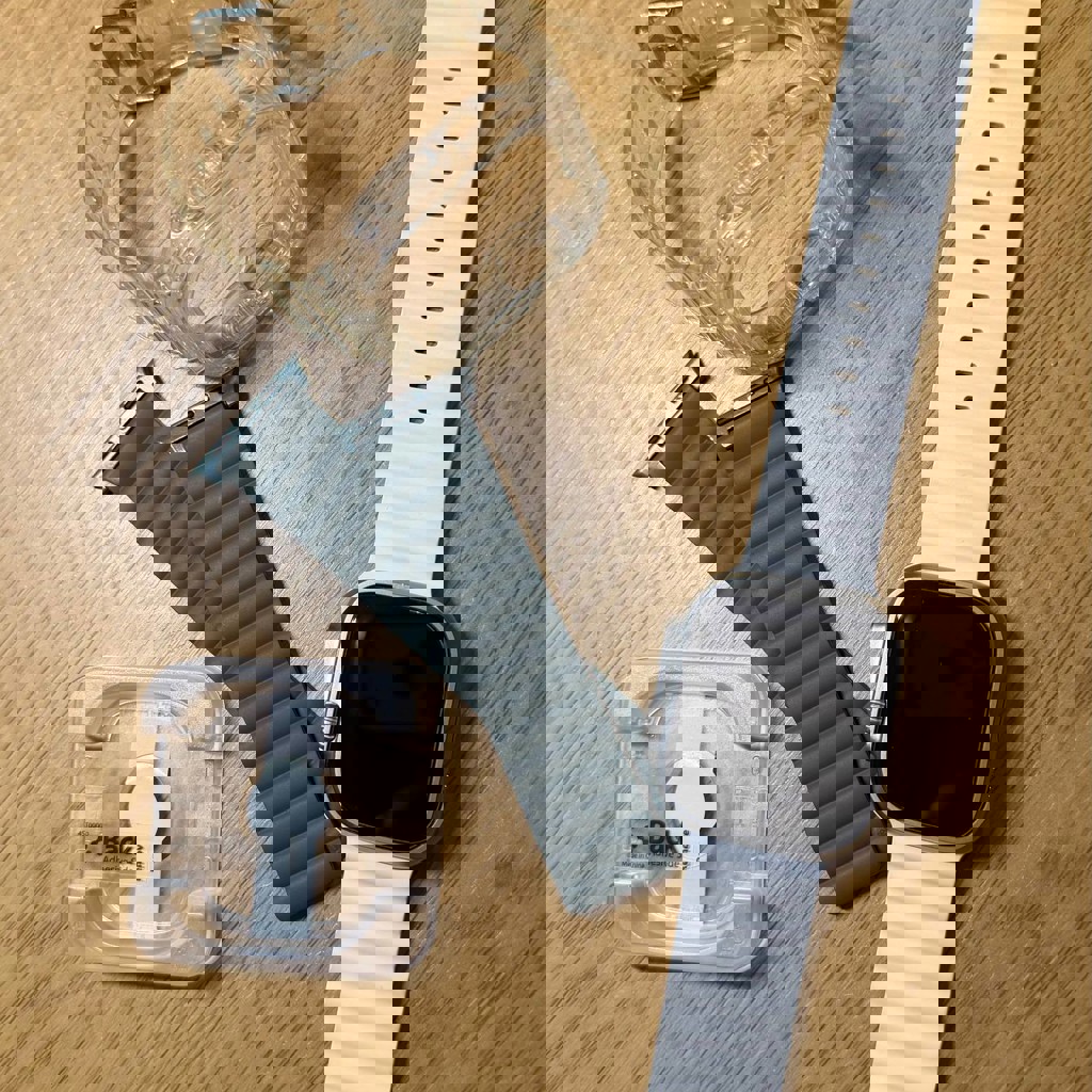 В комплекте — оригинальный белый ремешок, дополнительно два качественных неоригинальных ремешка и защитное стекло. Батарея 97 %. На самих часах с первого дня наклеено защитное стекло. Часы в отличном состоянии.