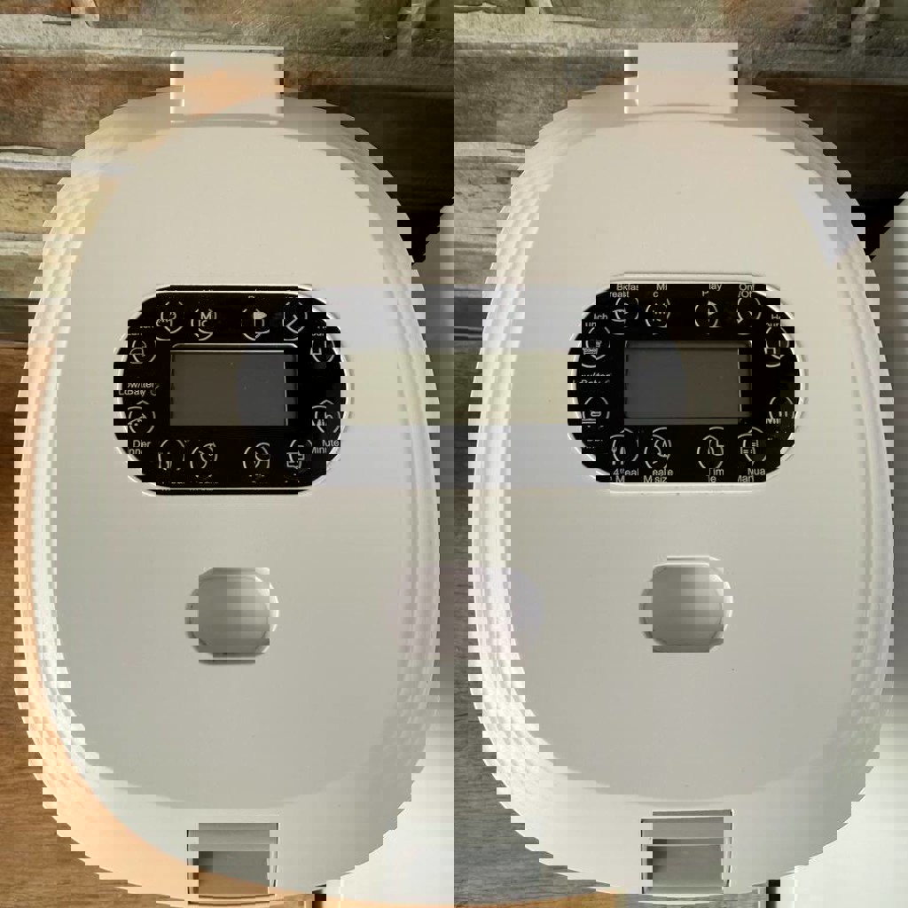 В короб помещается 1,5 кг корма. Рассчитана на 4 приема пищи. Камеры и управления с телефона нет.