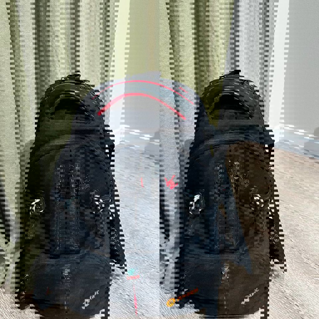 С защищенным от ударов отделом для лаптопа, с чехлом от дождя, очень функциональный.