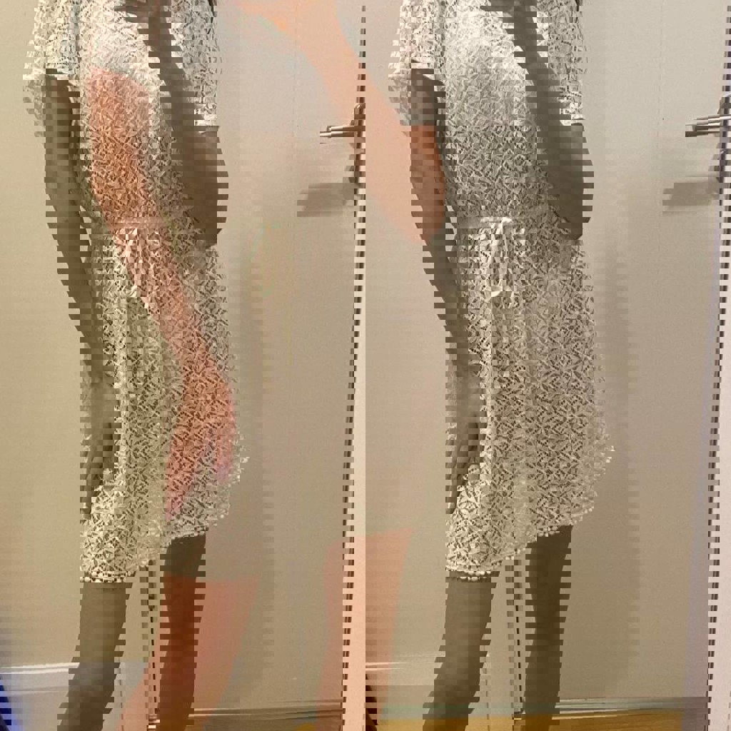 Базовая женственная пляжная накидка - туника, парео - платье - халат ажурная, белого цвета. Бренд OASIS, размер по бирке S, но подойдёт и на XS или M за счет того, что тянется талия и сама модель свободная. Красиво садится по фигуре.