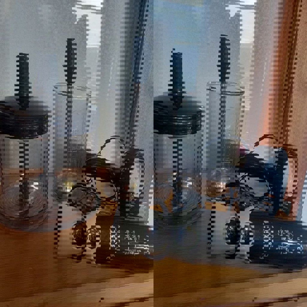 Хороший мощный блендер Bosch, также есть пара косметических нюансов, не влияющих на работу. Венчик есть, забыла положить для фото.