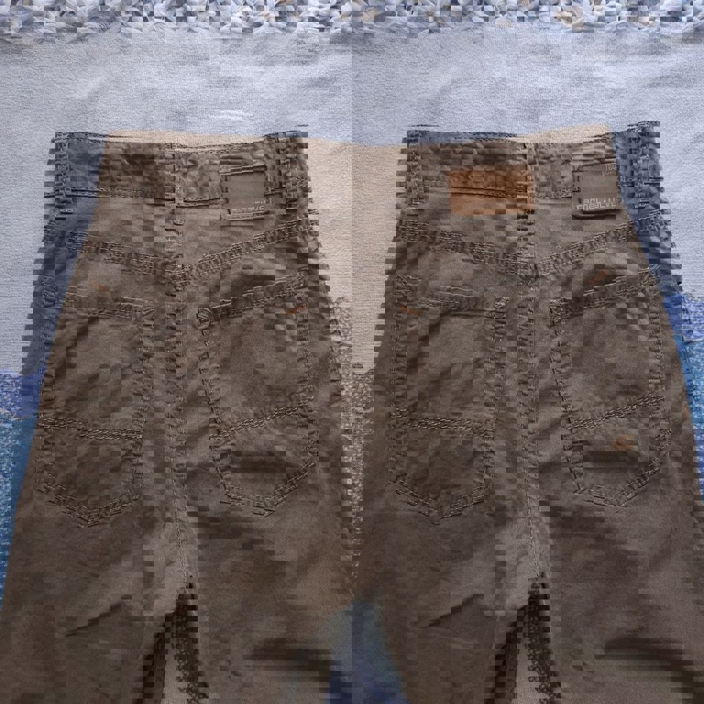 Бежево-хакки цвет, хлопок (с небольшим добавлением эластана), ткань с эффектом wash-out (винтажная фактура), плотный хлопок с лёгким стрейчем, универсальный casual / utility стиль