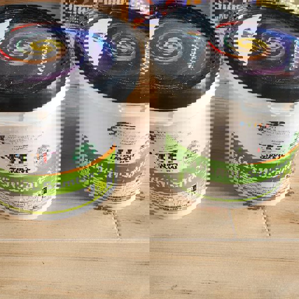 Не использовалась, оказалась лишней. Не разбавлена, 2 ведра по 2.5 литра. Для стен и потолков. Расход 120мл/м2 в 1 слой.