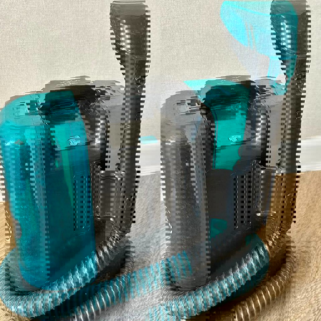 Отлично подходит для ковров, мебели, обивки, где нужна глубокая очистка: мощность 150 Вт, бак на 1,5 л, шланг 1,3 м, разный выбор насадок, отдельные баки для чистой и грязной воды. Был в активном использовании всего недело, но по мощности немного не дотягивал до рабочих задач. Шланг чуть чуть начал отходить — но устройство полностью исправно.
