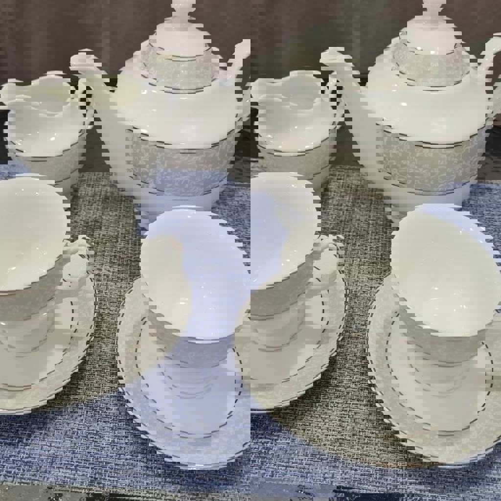 Изящный чайный сервиз из тонкого фарфора, украшенный изысканным узором в нежных серебристых тонах. В комплект входят чайник, две чашки с блюдцами и молочник. Этот набор станет прекрасным дополнением к вашему утреннему ритуалу или изысканному вечернему чаепитию.