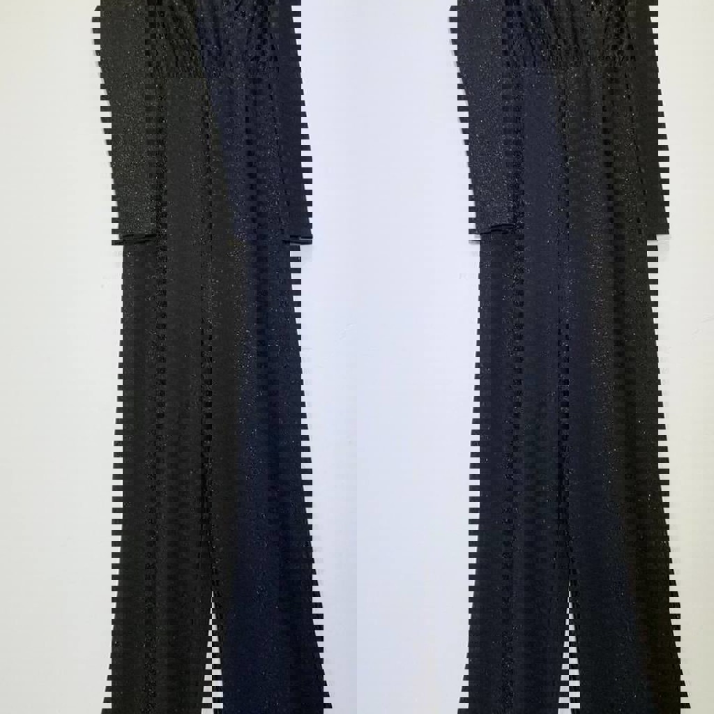 Сверкающий черный комбинезон p M-L на рост ~170 (тянется на бирке XL указан). Ткань красиво переливается при вечернем свете, мягкая и хорошо тянется. Верх на запах, в талии резинка, брюки свободный крой. (как домашняя одежда тоже подойдет)
