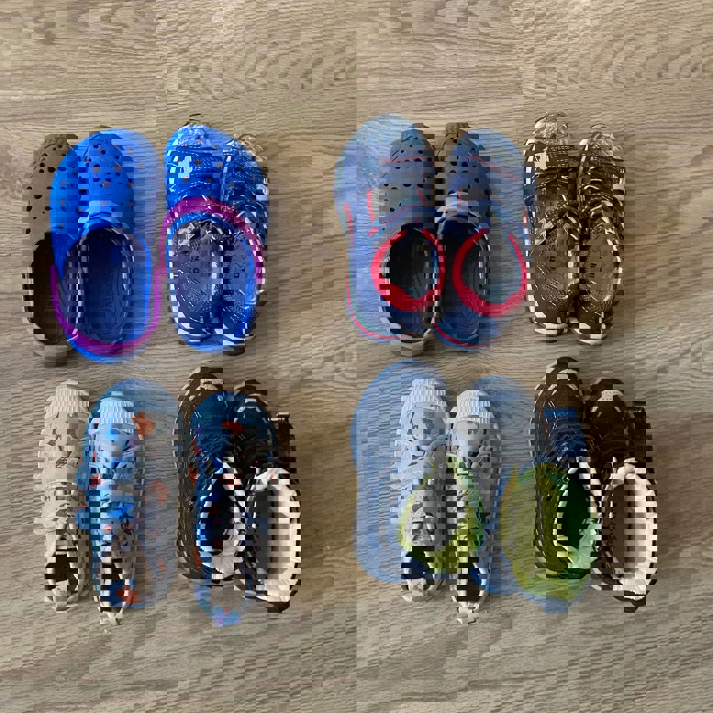 Обувь детская - любая пара за 5 лари. Кеды серые 23 размер, кроксы синие 25 размер, сандали синие 25 размер, ботинки черные 22 размер (Бесплатно, сломана собачка, но застегнуть можно).