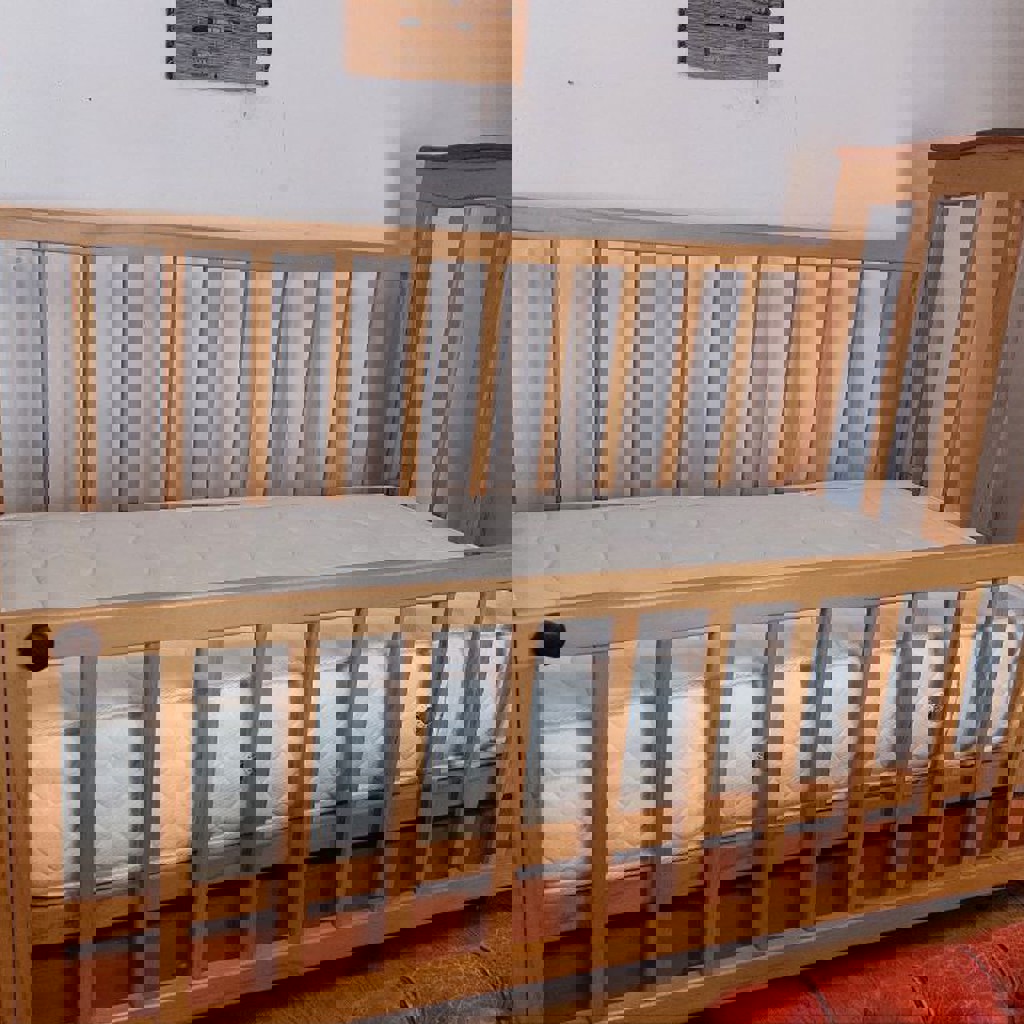 Сделано на заказ. Покрыт спец. лаком на водной основе. Матрас тоже заказной. Анти аллергичный. Можно вынимать штыри и кровать будет качаться. Размер матраса 70×140см.