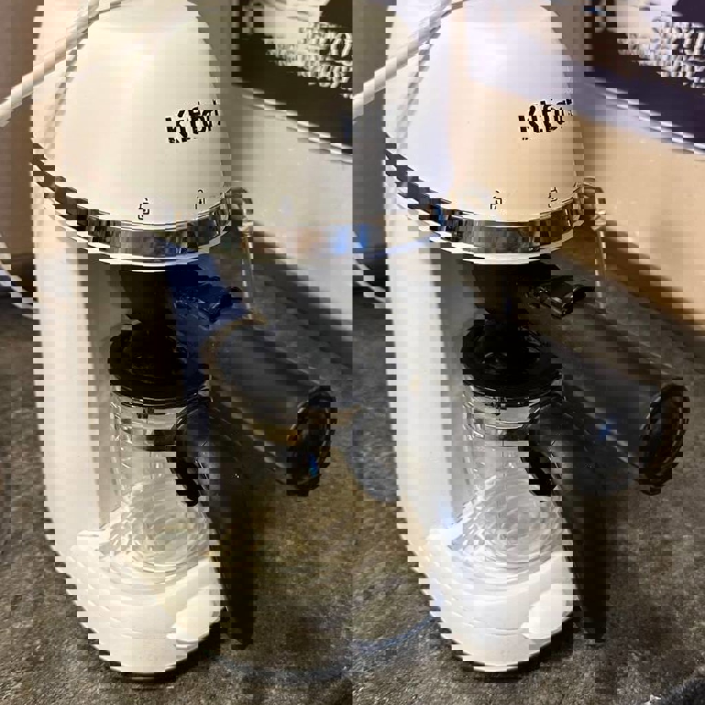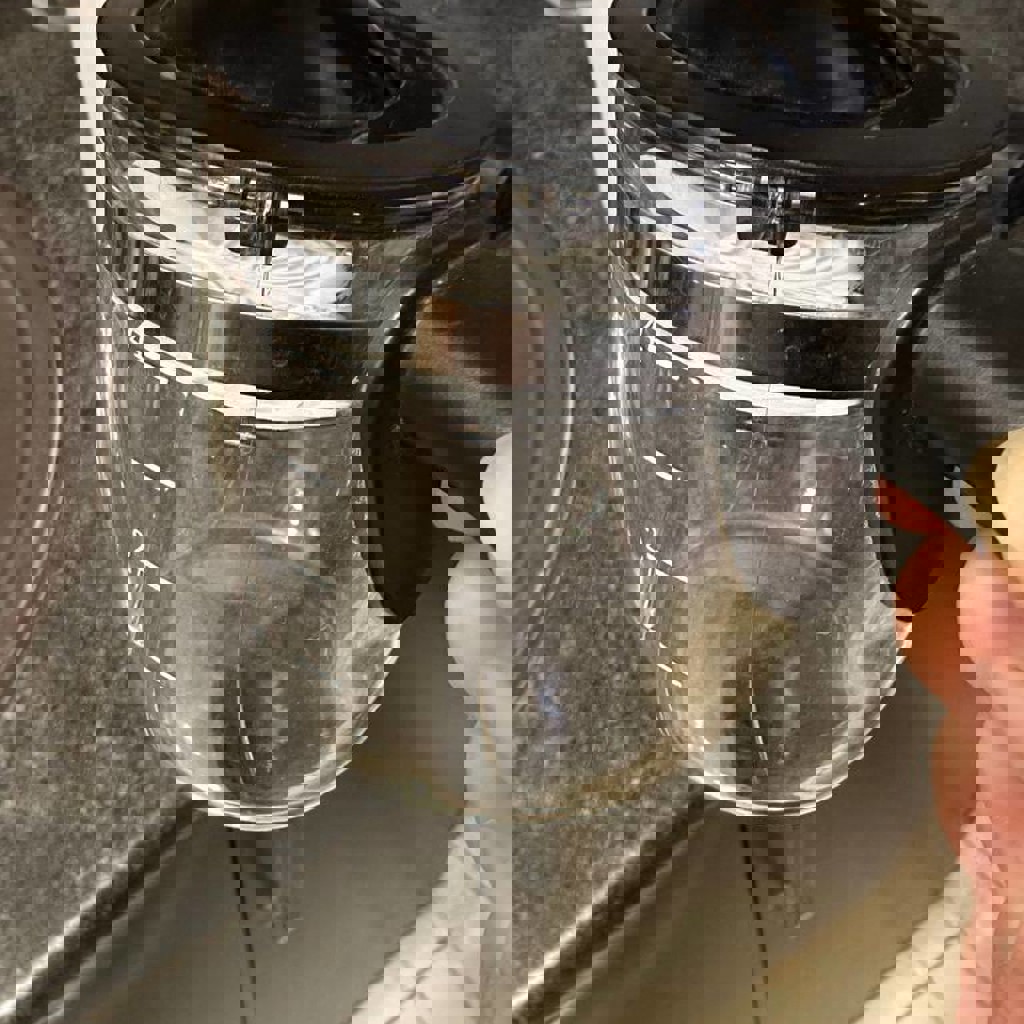 Состояние отличное, кран для взбития молока работает. Скол на стаканчике, но мы пользовались, ничего не протекает.