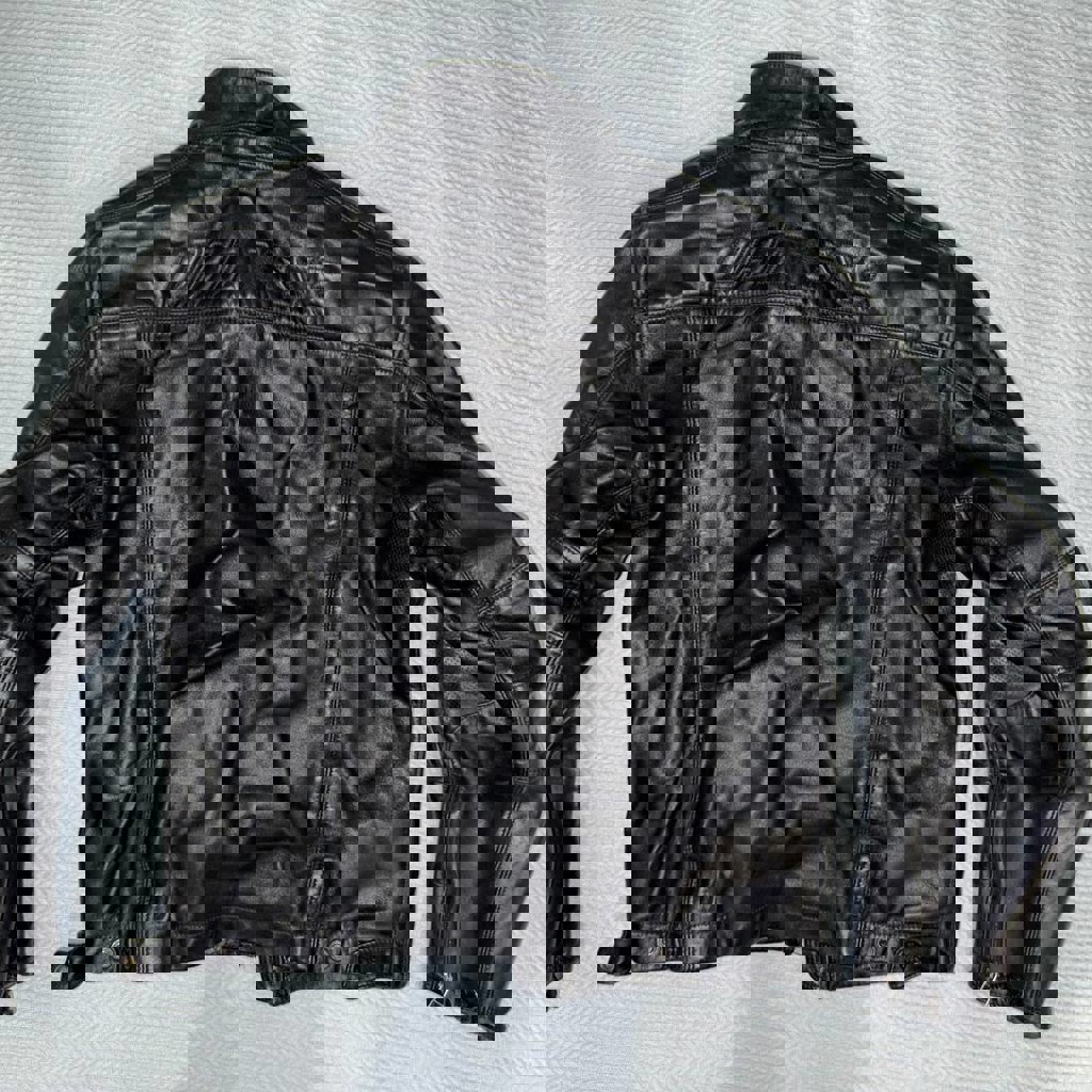 Оригинальная кожаная куртка, стиль винтажного кафе рейсера. В хорошем состоянии, мягкая и хорошо ухоженная кожа. Включены защитные элементы на локтях, но без брони на плечах и спине. Размер: 50 (подходит M-L). Идеально подходит для езды или повседневной носки.