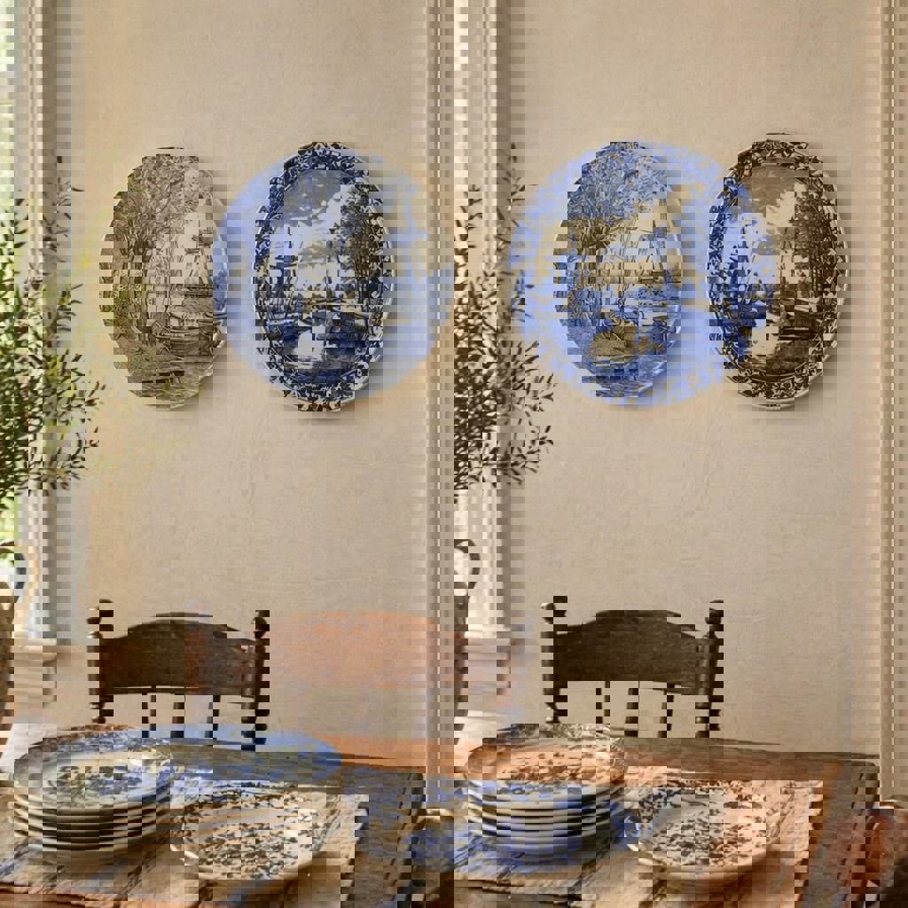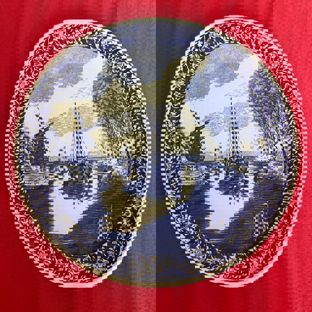 Delft Blue, декоративная настенная тарелка. Европа, ориентировочно середина XX века. Классический сюжет: мельница, парусные лодки, спокойный пейзаж. Диаметр ~29 см. Подойдёт для интерьера или коллекции.