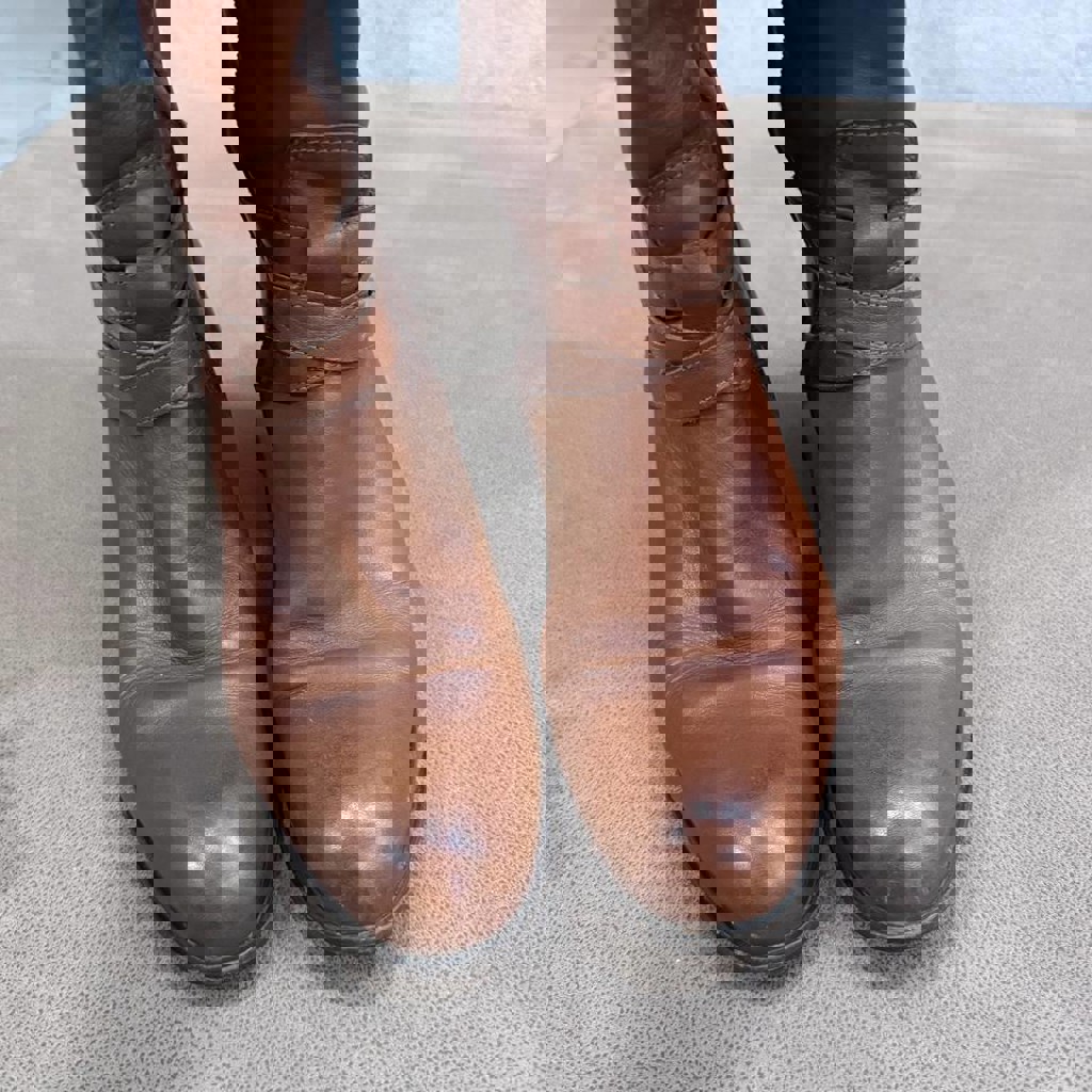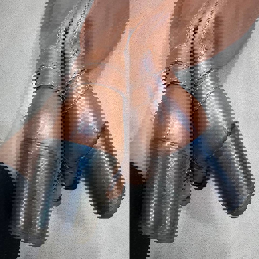 Натуральная кожа светло-коричневого (рыжего) оттенка. Декор: Ремешки вокруг щиколотки с массивной металлической пряжкой золотистого цвета, на которой выгравировано название бренда. Подошва: Устойчивый наборный каблук средней высоты темного цвета.