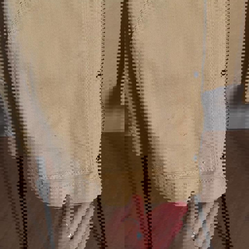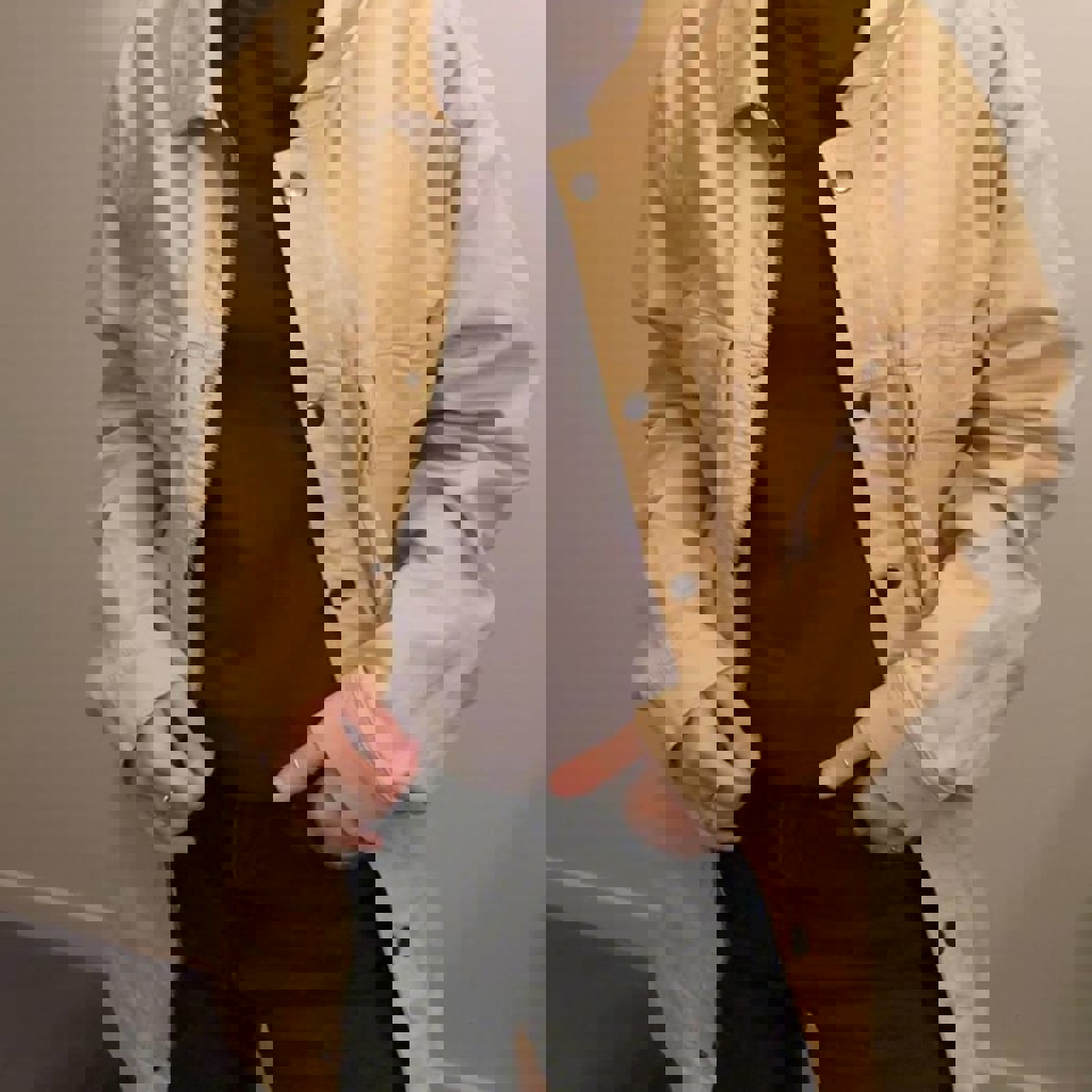 Очень плотная джинсовка, размер XL, брала на себя как оверсайз, оказалось слишком большой, надевала пару раз, есть небольшие зацепки от кошки на кармане.