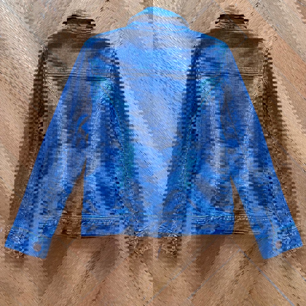Джинсовая куртка на девочку 128 размера, застегивается на кнопки, актуальный цвет на последнем фото, она не ярко синяя. Хорошее состояние