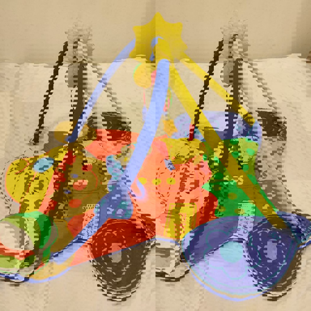 В хорошем состоянии, полностью разборный. Дуги крепятся на защёлках и прячутся в кармашки по углам. Нос у клоуна пищит. Заяц погремушка на ленточке убирается в специальный карман. Игрушки-подвески все оригинальные.