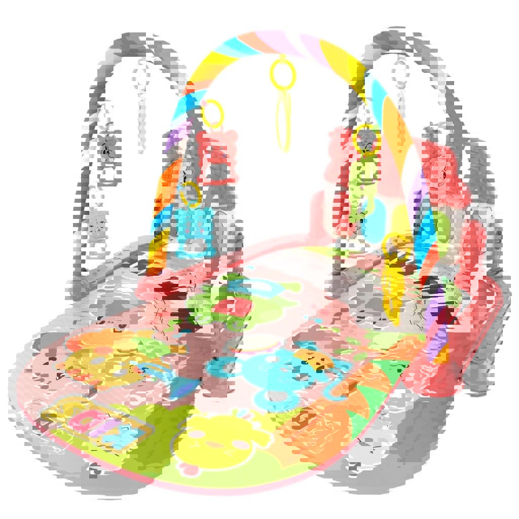 В комплект входит мягкий коврик (68*42 см), дуга с погремушками и зеркальцем, пианино со светящимися кнопками, на которые малыш может нажимать ножками, запуская разные звуки и мелодии (можно использовать отдельно, когда ребёнок подрастет). Заявлен производителем как экологически чистый продукт, соответствующий европейским стандартам качества (сертифицирован CE, EN 71). Состояние отличное