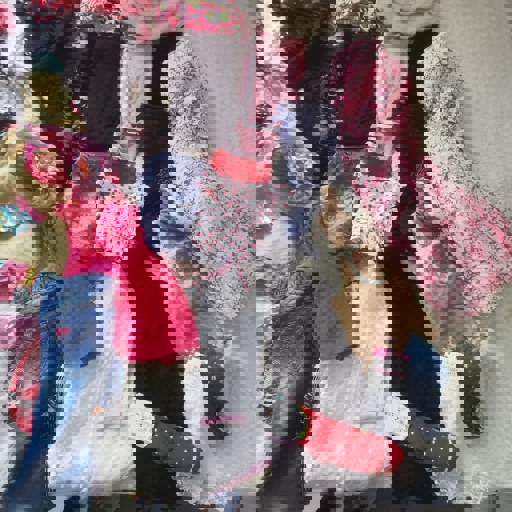 Все одним лотом. Около 50 вещей: 5 курток, комбинезон, жилетки, юбки, платья, шорты, купальник, колготки, майки и т.д. Все в идеальном состоянии, что-то даже новое. Вещи отличного качества. Размер от 92 до 120 (могу на пару размеров ошибиться).
