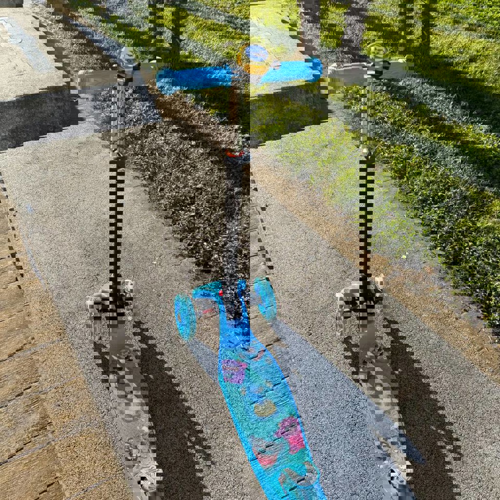 Синий детский трёхколёсный самокат с светящимися колёсами, складной конструкцией и телескопической ручкой. Подходит для детей весом до 50 кг.