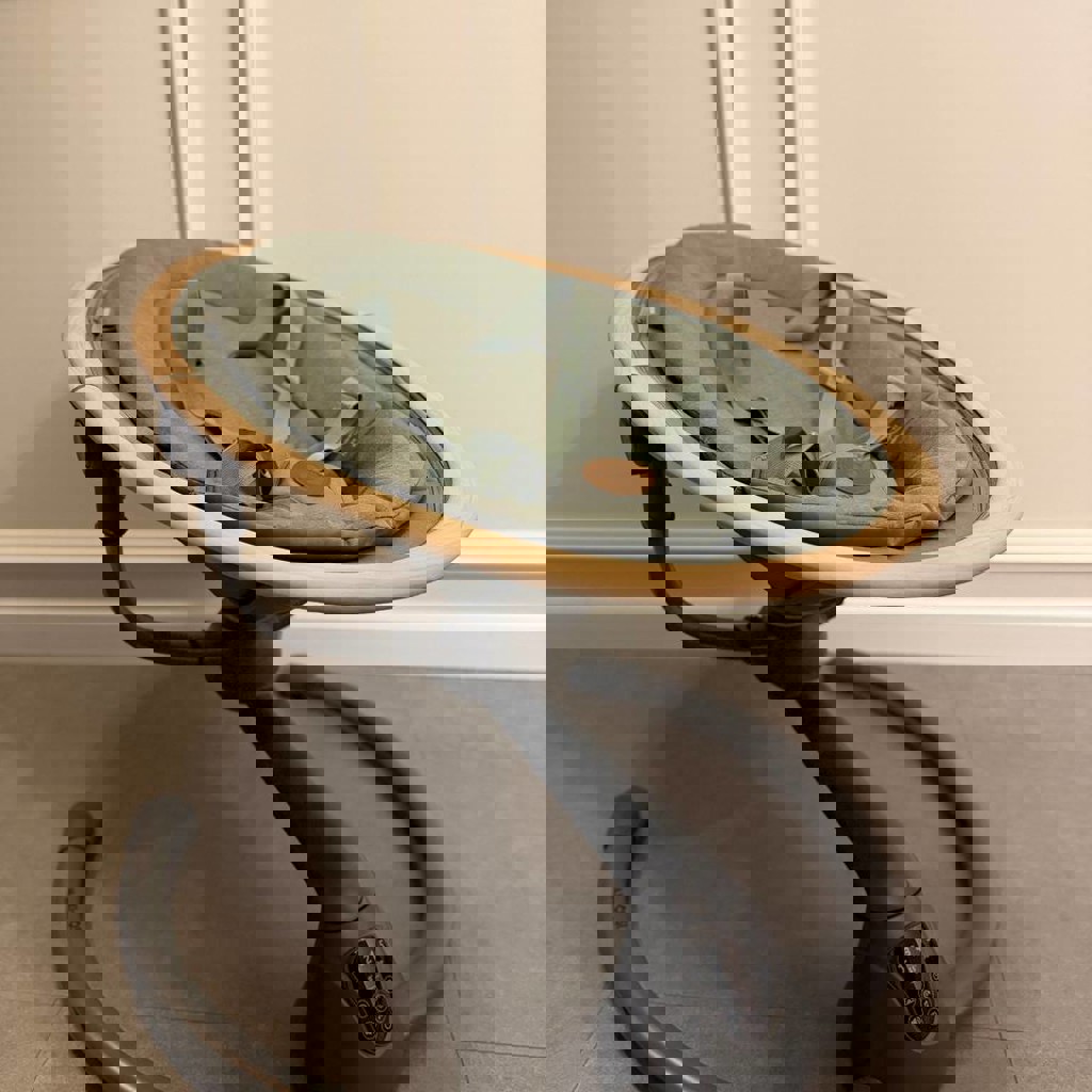 От 0 до 6 мес. Работает на батарейках либо от питания. Имеет 5 скоростей и 12 успокаивающих мелодий. Кресло оснащено ремнем безопасности и двумя положениями наклона.