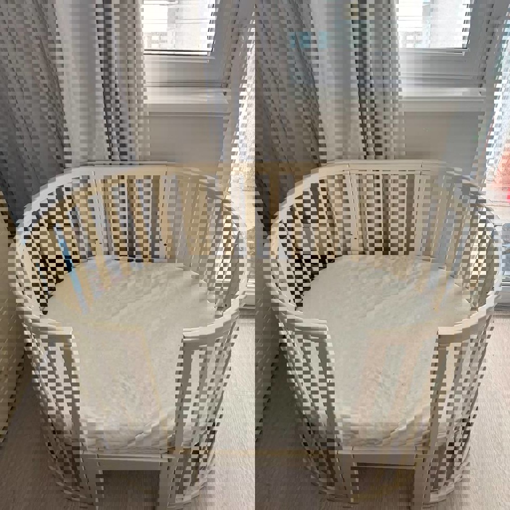 Продается детская кроватка и матрас фирмы Angelo. Трансформируется в круглую колыбельку для новорожденных, приставную кроватку со съемной стенкой, полноценную кроватку, манеж, диванчик. 2 положения ложа по высоте. В комплекте имеется маятниковый механизм. Изготовлена из экологически чистых и прочных материалов - массива ольхи. В комплекте имеются колеса. Матрас состоит из 3 частей, может использовать как круглой формы для колыбельной, так для овальной в кровать побольше. В подарок отдаем 2 непромокаемых наматрасника: на круглый матрас и на овальной формы. Простынь на резинке для круглого матраса. Дышащие бортики для кровати.