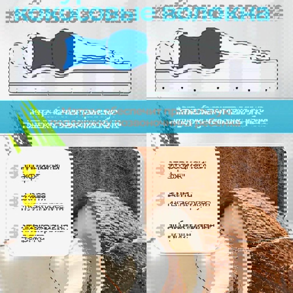 С кокосовой прослойкой. Бесклеевая сборка. 2 стороны жесткости. Гиппоаллергенен. Антибактериальная пропитка. Съемный чехол.