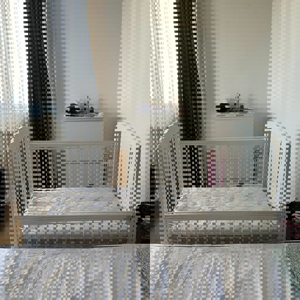 Кроватка детская Incanto, массив дерева, есть несколько потертостей. 2 уровня высоты, одна стенка опускается, можно использовать как приставную. Есть съемные колесики. Матрас Plitex bamboo nature, ортопедический из кокосового волокна 120х60 см, в отличном состоянии. Бортики и 2 простынки в подарок.