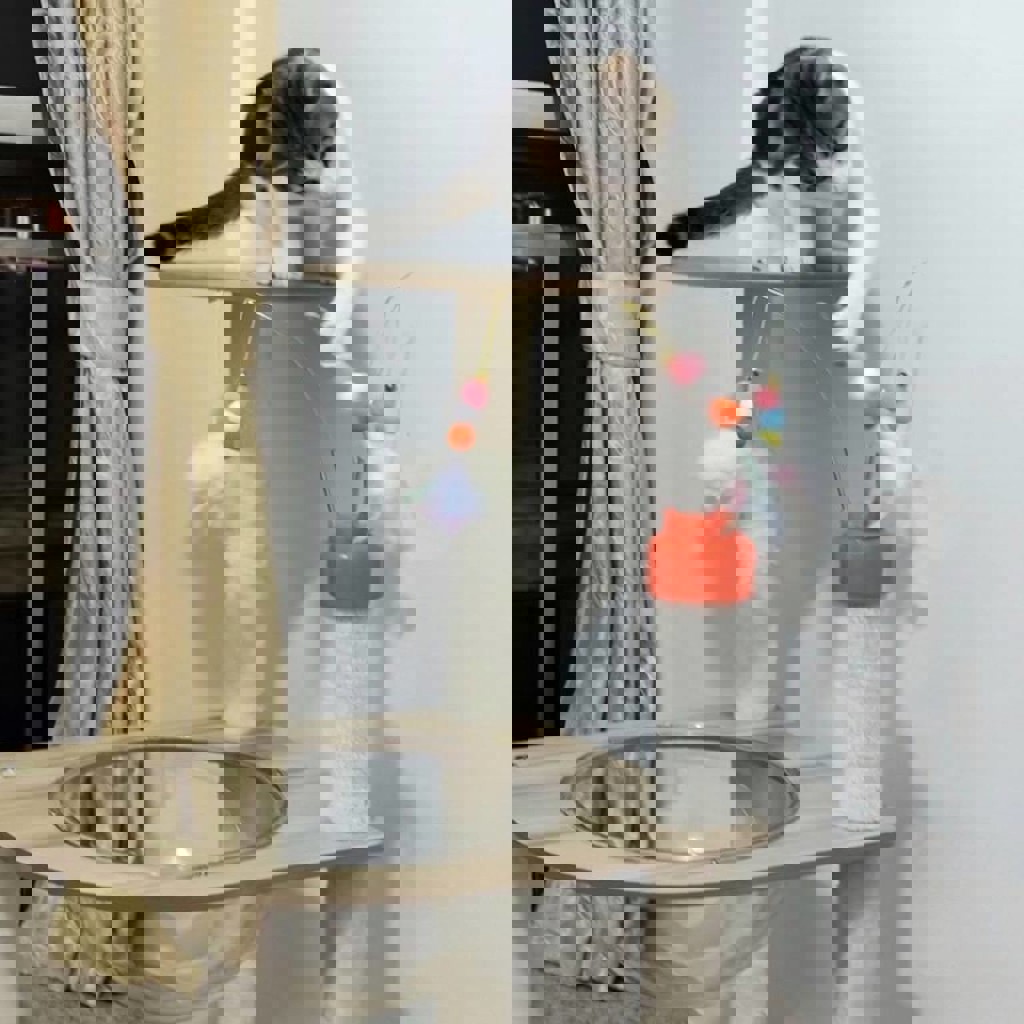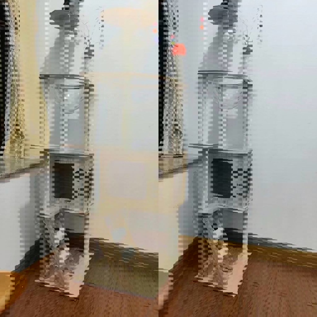 Вообще без следов использования. Не шатается, надежная конструкция. Кот может бегать и прыгать без риска опрокинуть. Тут и когтеточка (столбики с джутом/сизалем), и уютные домики, и лежанки на разных уровнях. Включает в себя подвесные игрушки, уютные домики, верхнюю лежанку с мягким бортиком и прозрачный гамак-аквариум. Выглядит стильно и современно, отлично впишется в интерьер. Материалы добротные, прослужит долго. Высота 120 см.