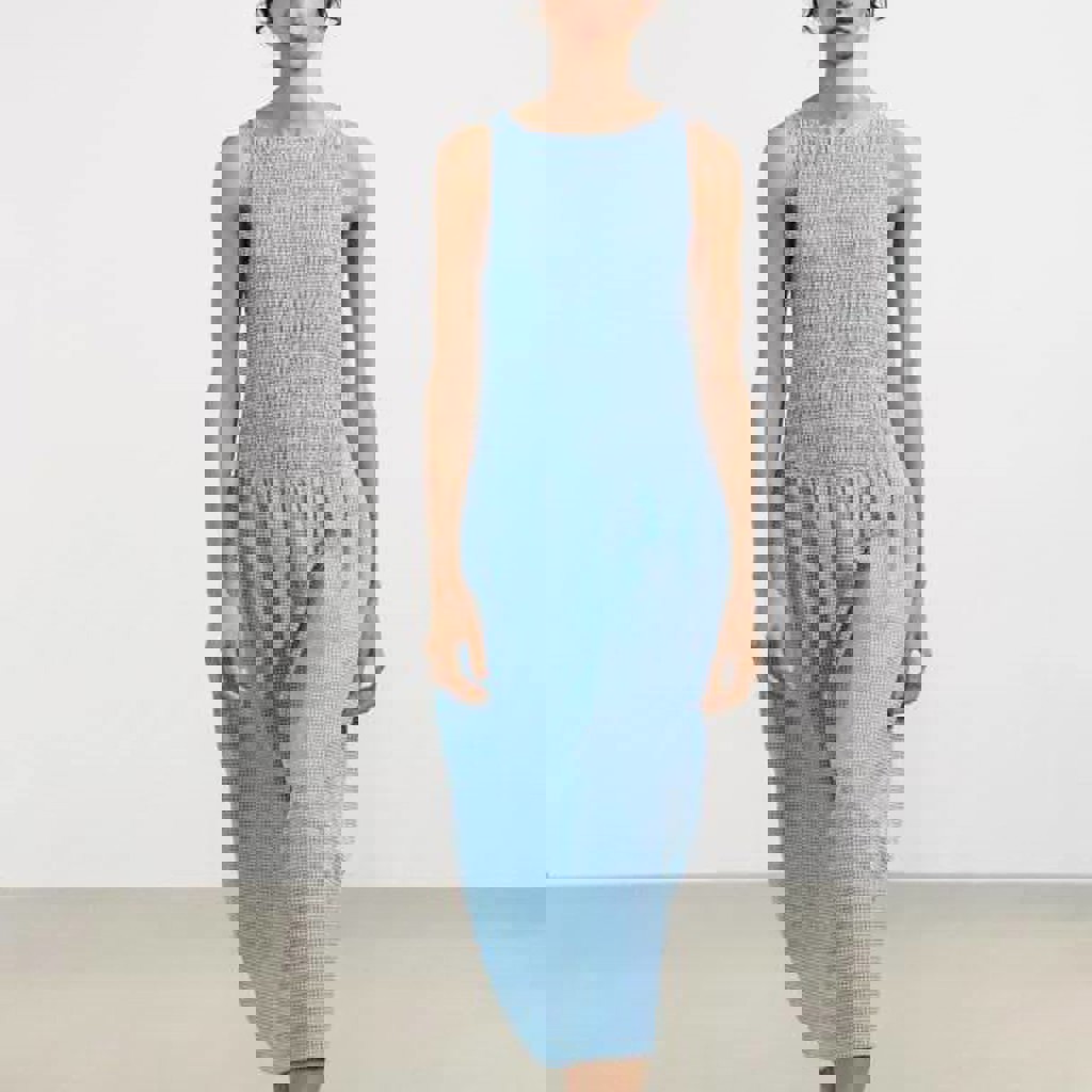 Платье-миди голубое в белую клетку виши от бренда Zara, в размере L. Покупала летом, надевала один раз, поняла что не подходит по стилю. Круглый вырез, сборки в верхней части.