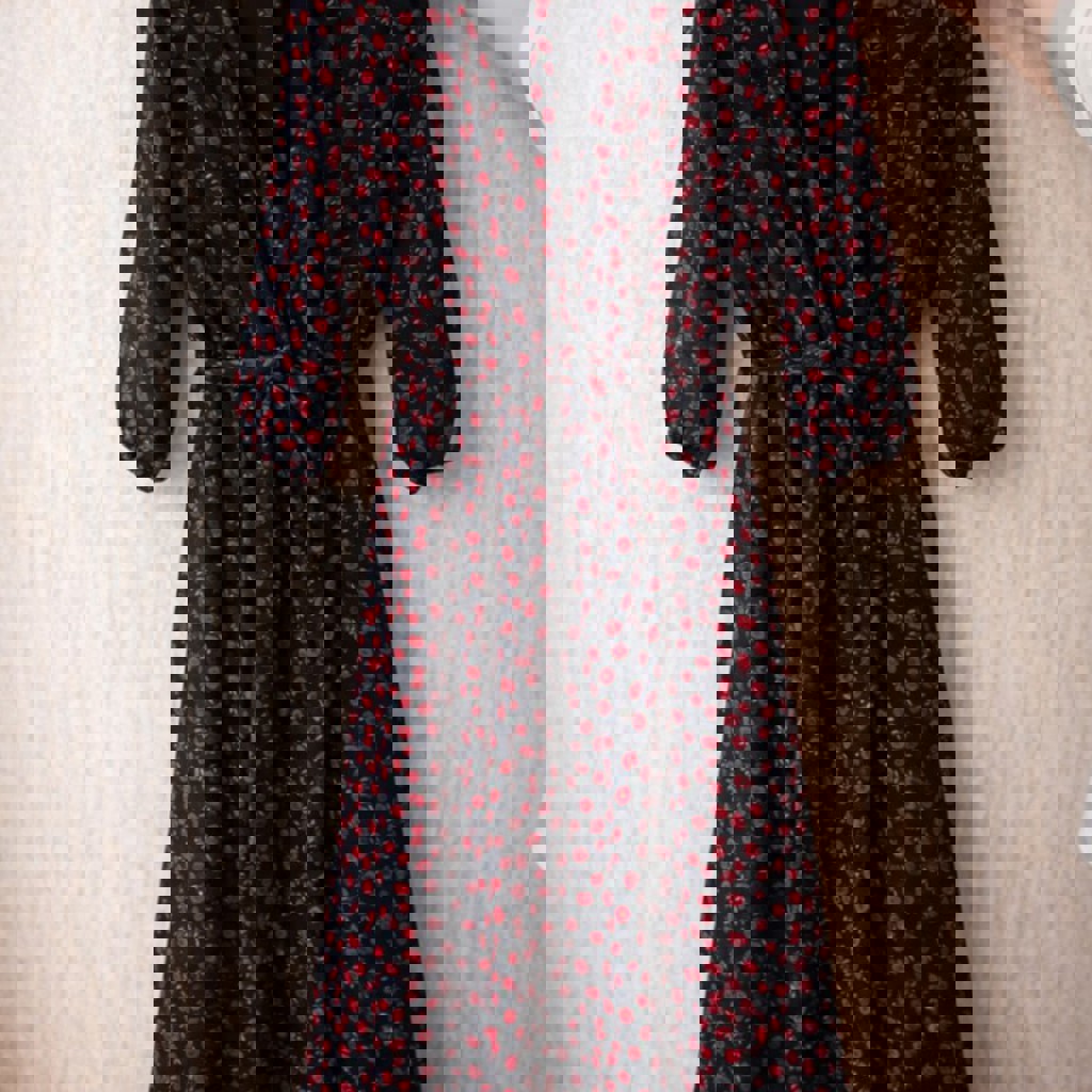 Лёгкое платье на запах с поясом — очень красиво садится по фигуре, подчёркивает талию и создаёт аккуратный силуэт. Полупрозрачная ткань с подкладкой, струится при движении. Принт с мелкими красными цветами на чёрном фоне — выглядит ярко, но при этом универсально. Рукава 3/4, удобная длина миди. Подойдёт и на каждый день, и на выход. Ткань приятная, лёгкая. Состояние отличное. Возможна примерка.