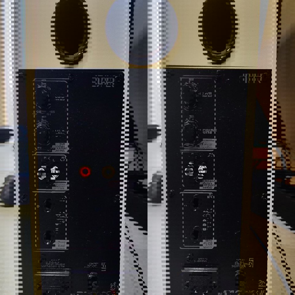 Активная пара студийных bookshelf-спикеров (4" НЧ + 1" ВЧ), мощность 21+21 Вт RMS, частоты 60 Гц–20 кГц, MDF-корпус для чистого звука без резонанса. Режимы Monitor (плоская АЧХ для продакшена) и Music (для повседневного прослушивания), входы TRS-баланс/RCA/AUX + headphone out. Идеально для музыки, видео, подкастов, музыки продакшена (Ableton и т.д.) или как ПК-динамики — звук детальный, бас глубокий, твиттер мягкий. Состояние отличное, коробка есть, кабели в комплекте.