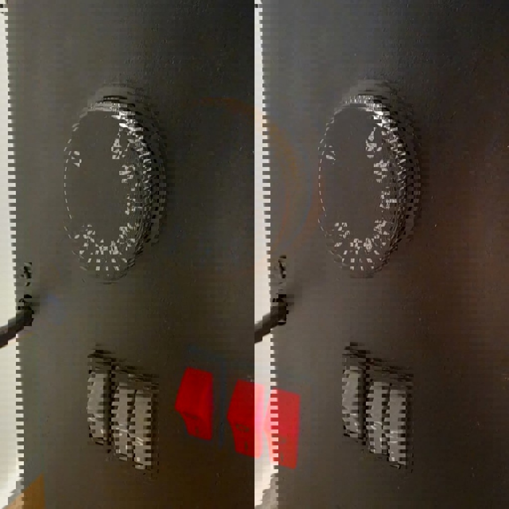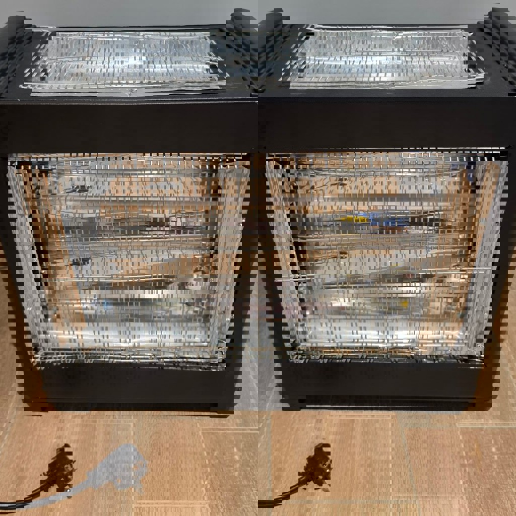 Электрический обогреватель (кварцевый) с 3 нагревательными элементами: 2 лампы спереди и 1 сверху для лучшей конвекции. 3 переключателя позволяют включать лампы по отдельности, регулируя мощность. Термостат: Крутилка сбоку для автоматического поддержания заданной температуры. Начинает отдавать тепло сразу после включения. Защитные решетки на передней и верхней панелях, на дне кнопка-защита от опрокидывания. Полностью рабочий, все лампы светят, корпус без повреждений.
