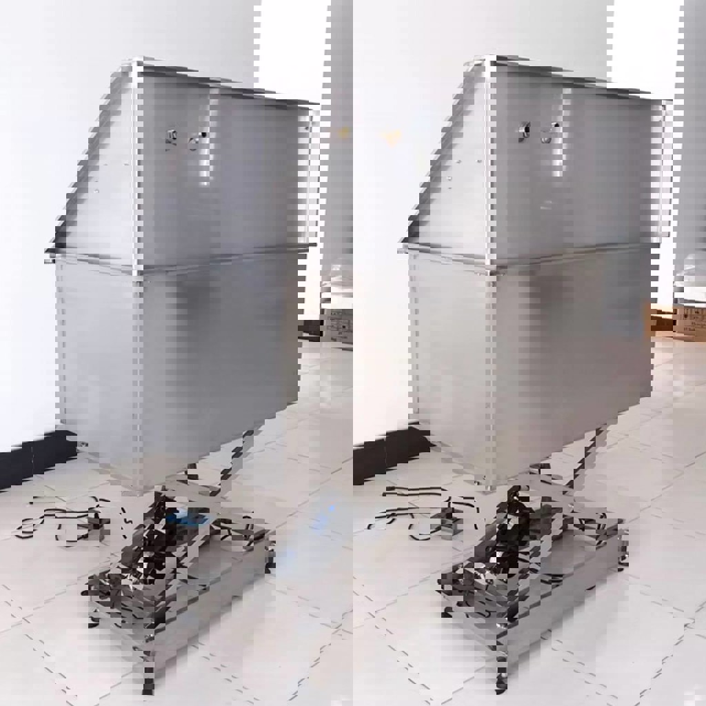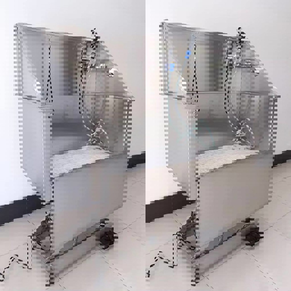 Новая электрическая ванна для груминга животных. Размер: 130 × 74 × (117–160) см. Материал: нержавеющая сталь 304 (1.2 мм). Электрическая регулировка высоты, кран высокого давления. Подходит для собак и кошек. Идеально для груминг-салонов.