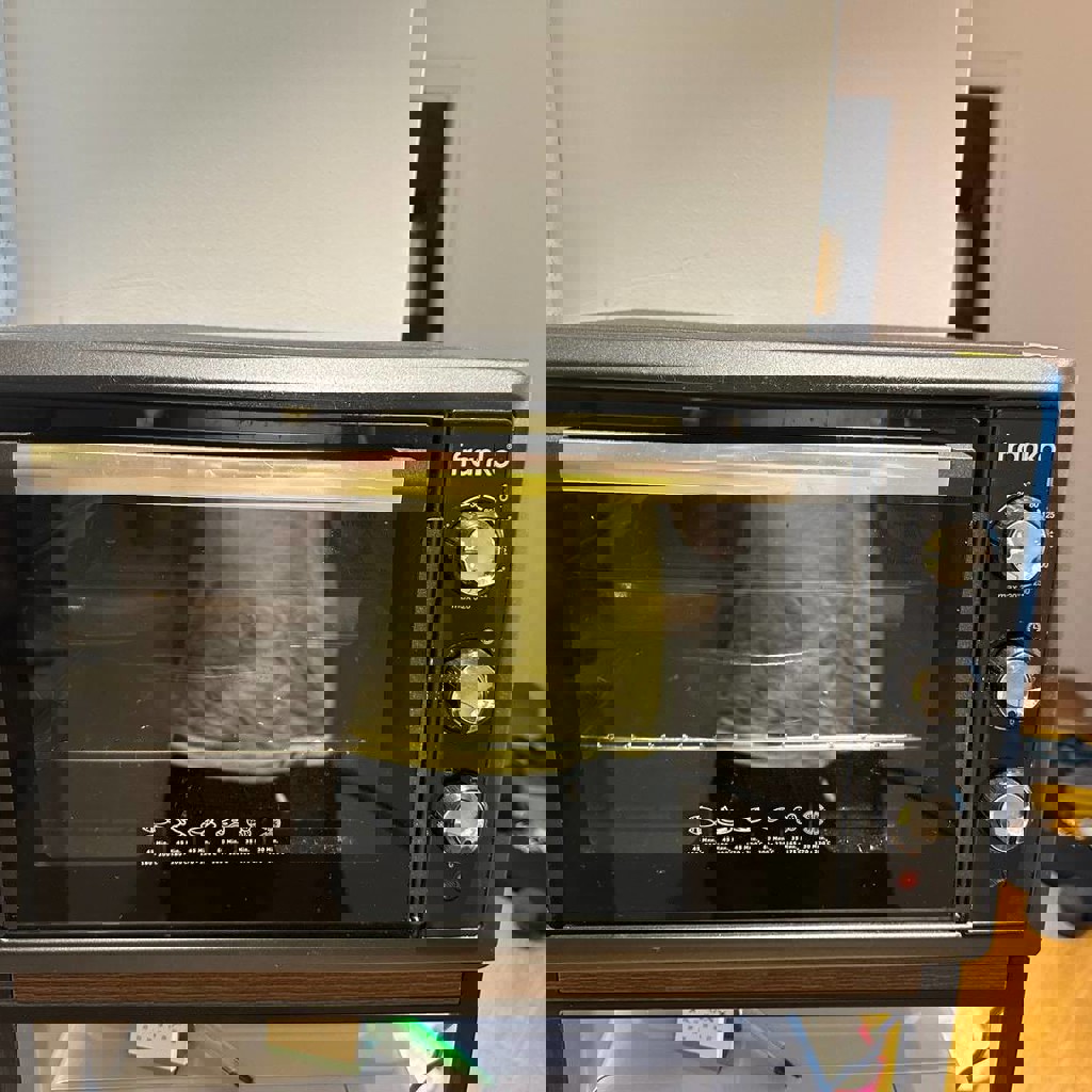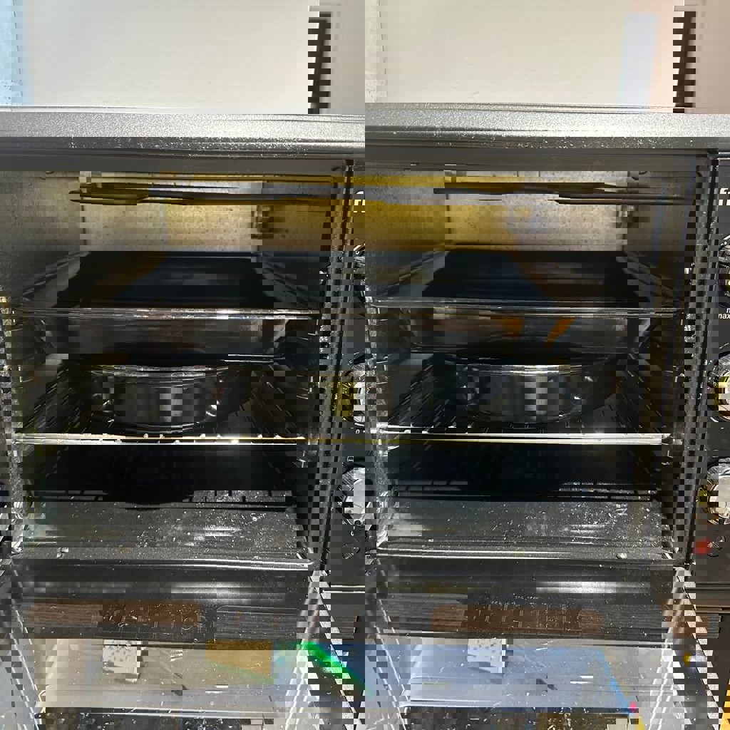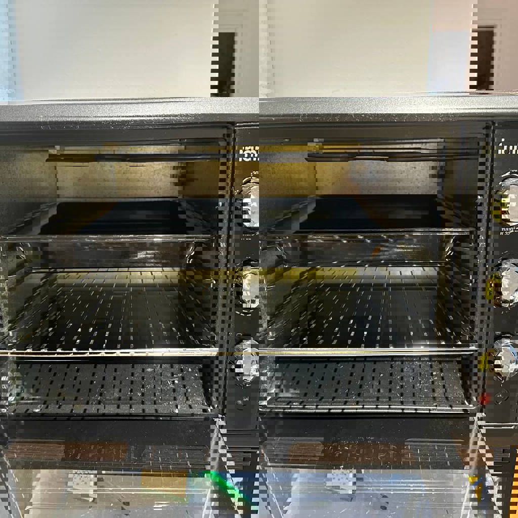 1300W. Есть режим размораживания, подогрева и быстрого приготовления. Механический таймер до 60 минут и максимальная температура 320 градусов. В комплект входят: 1 круглый, 1 квадратный противень и сетка.