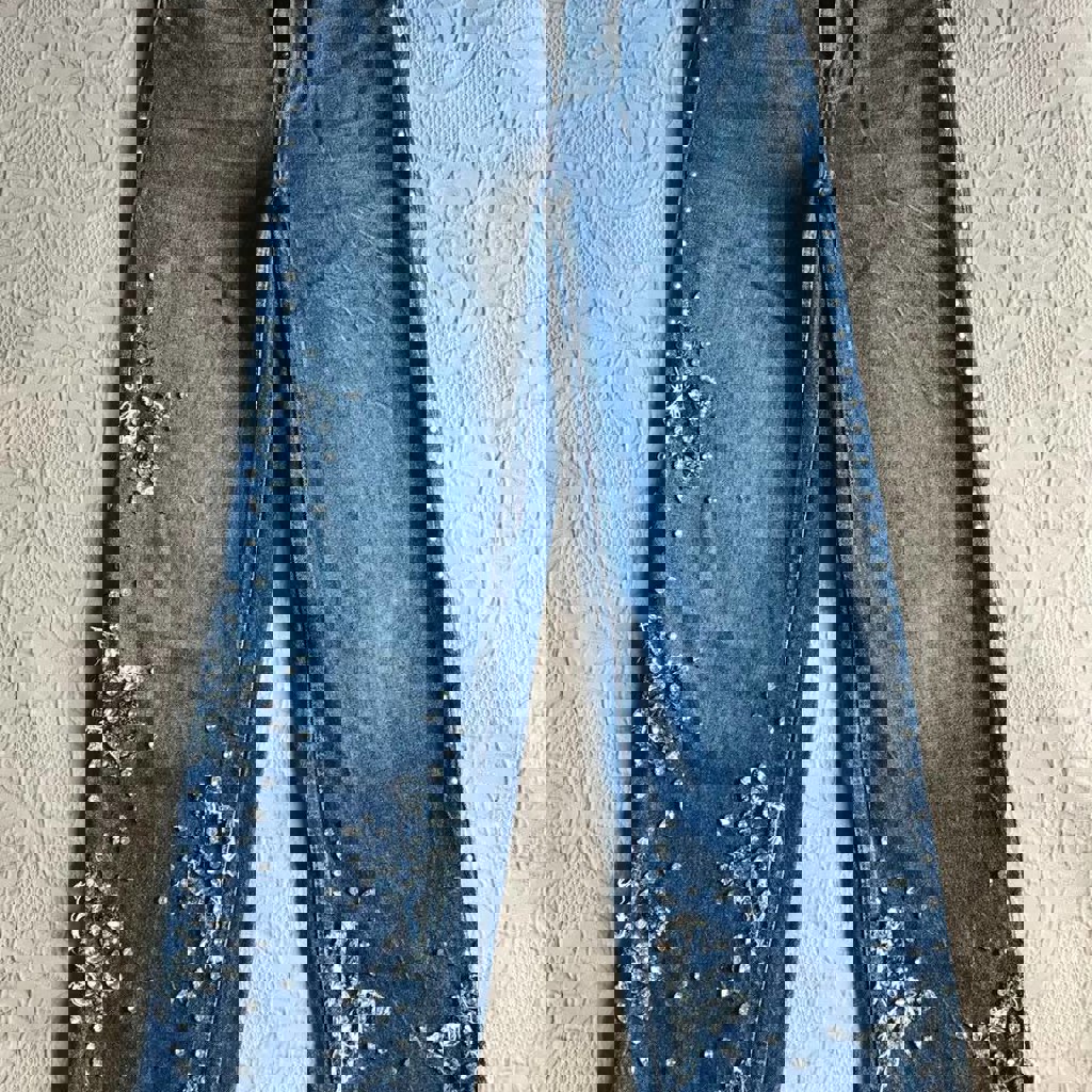Эксклюзивные джинсы, расшитые камнями, ручная работа. В хорошем состоянии, размер 34-36. Плотная джинса, 100% хлопок. Очень мало носила.