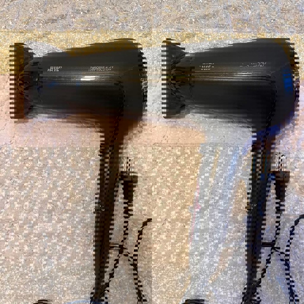 Мощный и удобный, быстро сушит волосы без перегрева. Есть несколько режимов скорости и температуры, кнопка холодного воздуха. В хорошем состоянии, работает исправно.