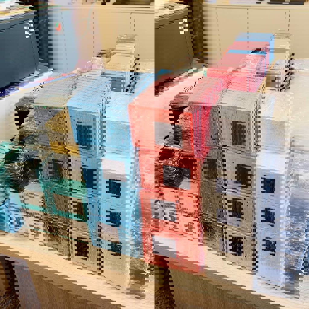 Две упаковки новых файлов для бумаги и корзинка для сортировки готовой продукции.