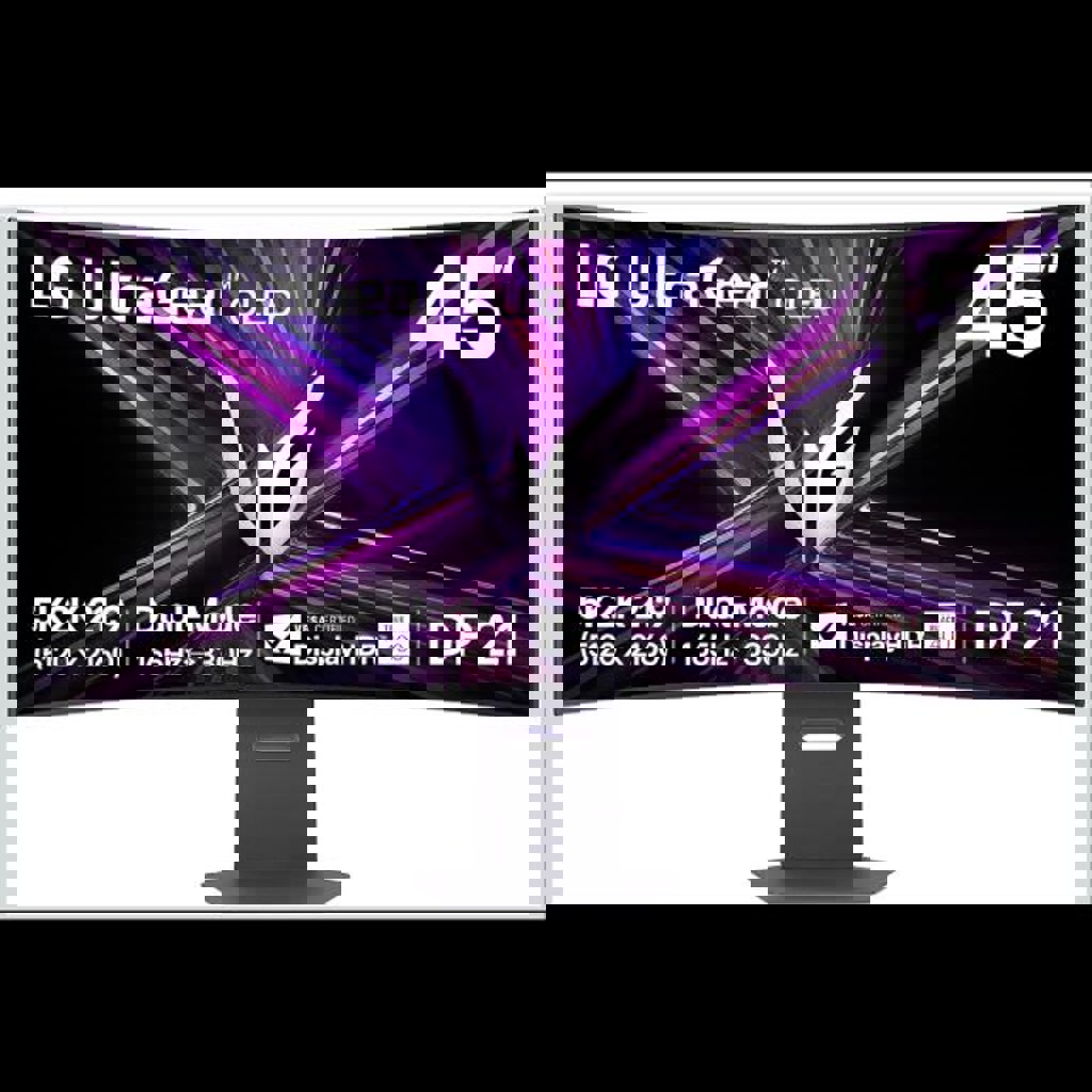 LG UltraGear 45GX950A-B, экран 44.5" Curved OLED (21:9), разрешение 5120 x 2160 (5K2K UltraWide), частота обновления до 165 Hz, Dual Mode 2560 x 1080 @ 330 Hz для сверхплавного гейминга, время отклика 0.03 ms, поддержка HDR10 / DisplayHDR True Black 400, Adaptive Sync: NVIDIA G-SYNC + AMD FreeSync Premium Pro, порты: DP 2.1, HDMI 2.1×2, USB-C с PD 90 W, встроенные динамики.