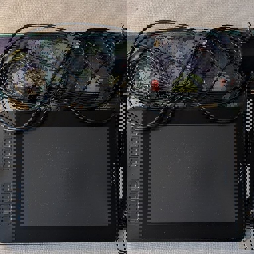 Графический планшет с экраном 11.6". Состояние: использовался очень мало. Работает идеально. Экран: царапины только на защитной антибликовой плёнке (стандартно), легко снимается. Комплект полный: планшет, стилус + насадки, подставка для стилуса, доп. подставка для планшета, все кабели (HDMI, USB, питание). Коробка отсутствует.