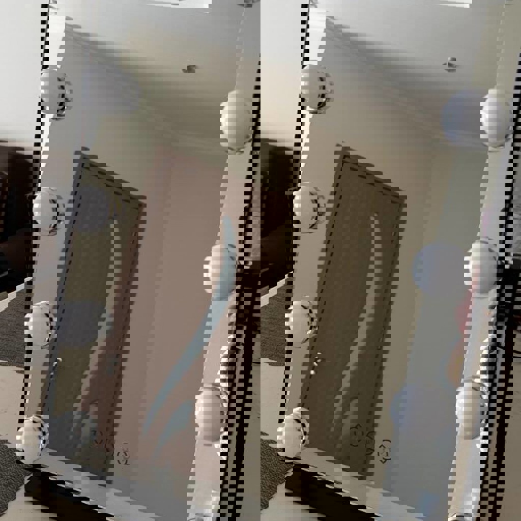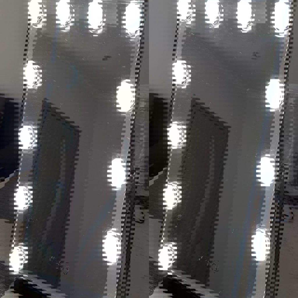 Ширина 35 см, высота 40 см, металлический корпус, 3 регулируемых режима подсветки, сенсорное управление, мягкое противоскользящее покрытие. Всё целое, полностью рабочее. Без дефектов. Работает от разетки.