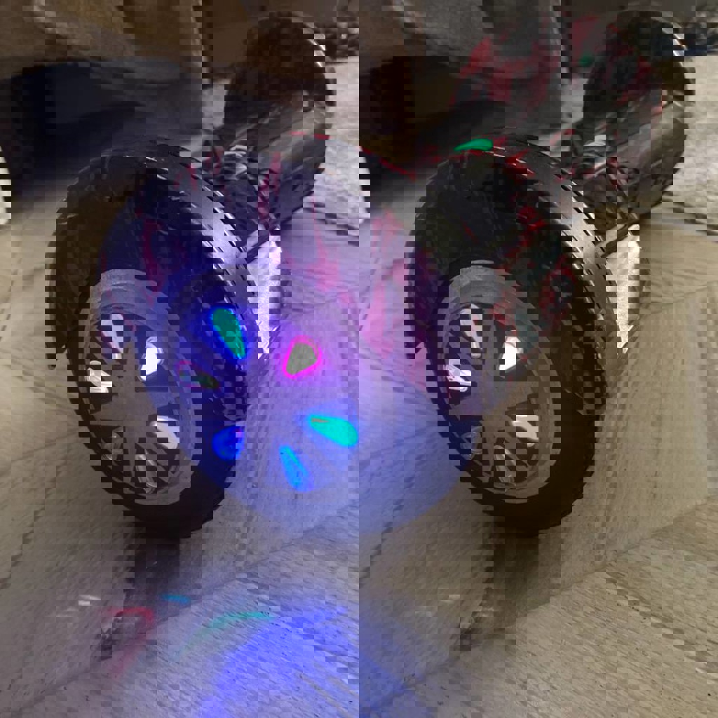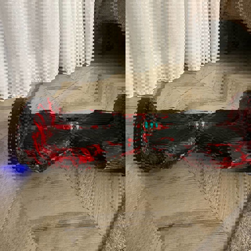 Гироскутер красно-черного цвета с ручкой, колеса светятся, есть потертости на некоторых углах, комплектуется ключом дистанционного управления и блоком заряда аккумулятора.
