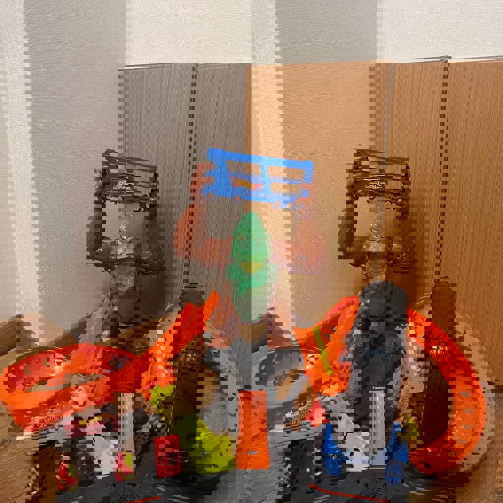 Гоночная трасса ХотВилс с гориллой, коробом для хранения машинок, полным машинок! Играли несколько раз с удовольствием с друзьями, простаивает сейчас, уже вырос из нее сын.