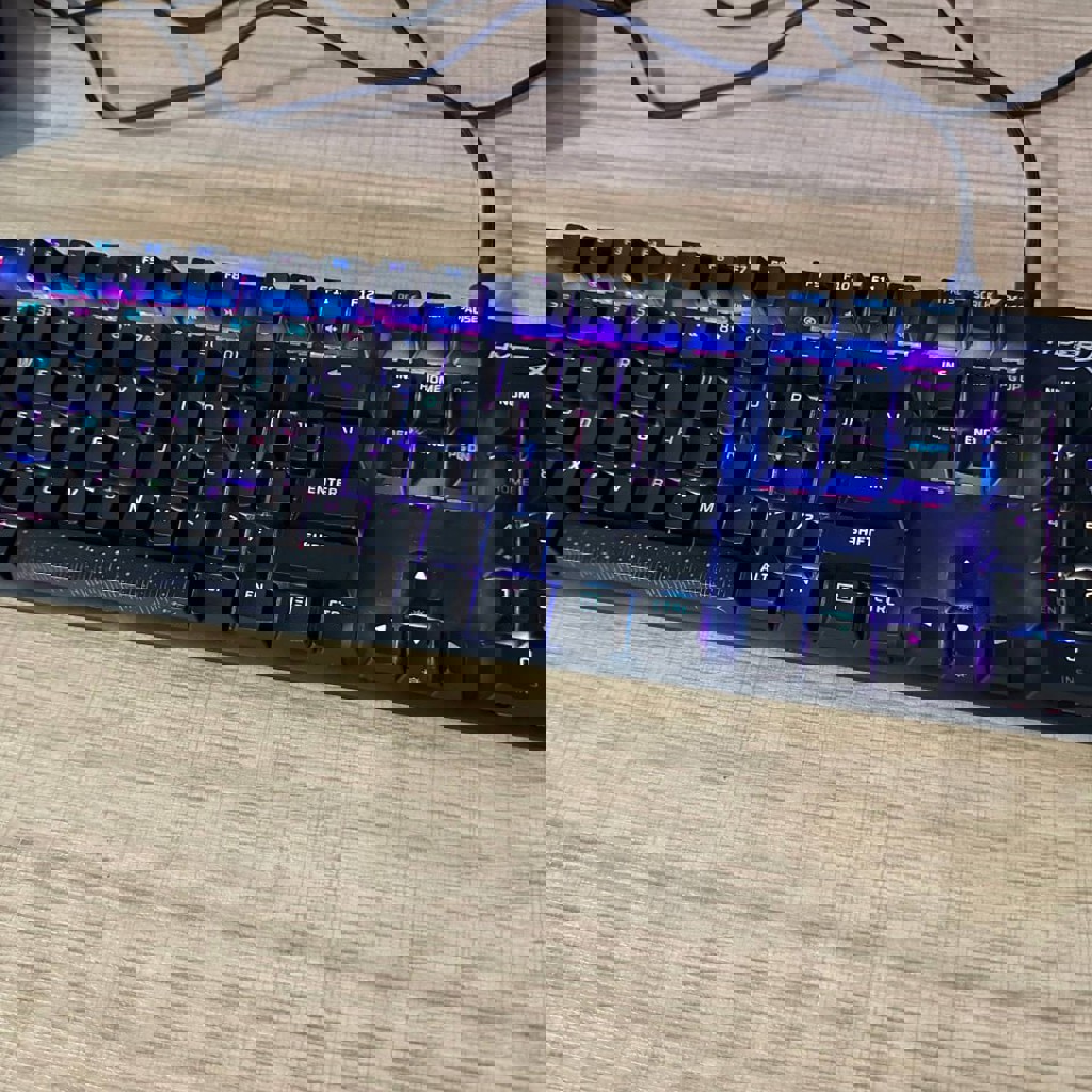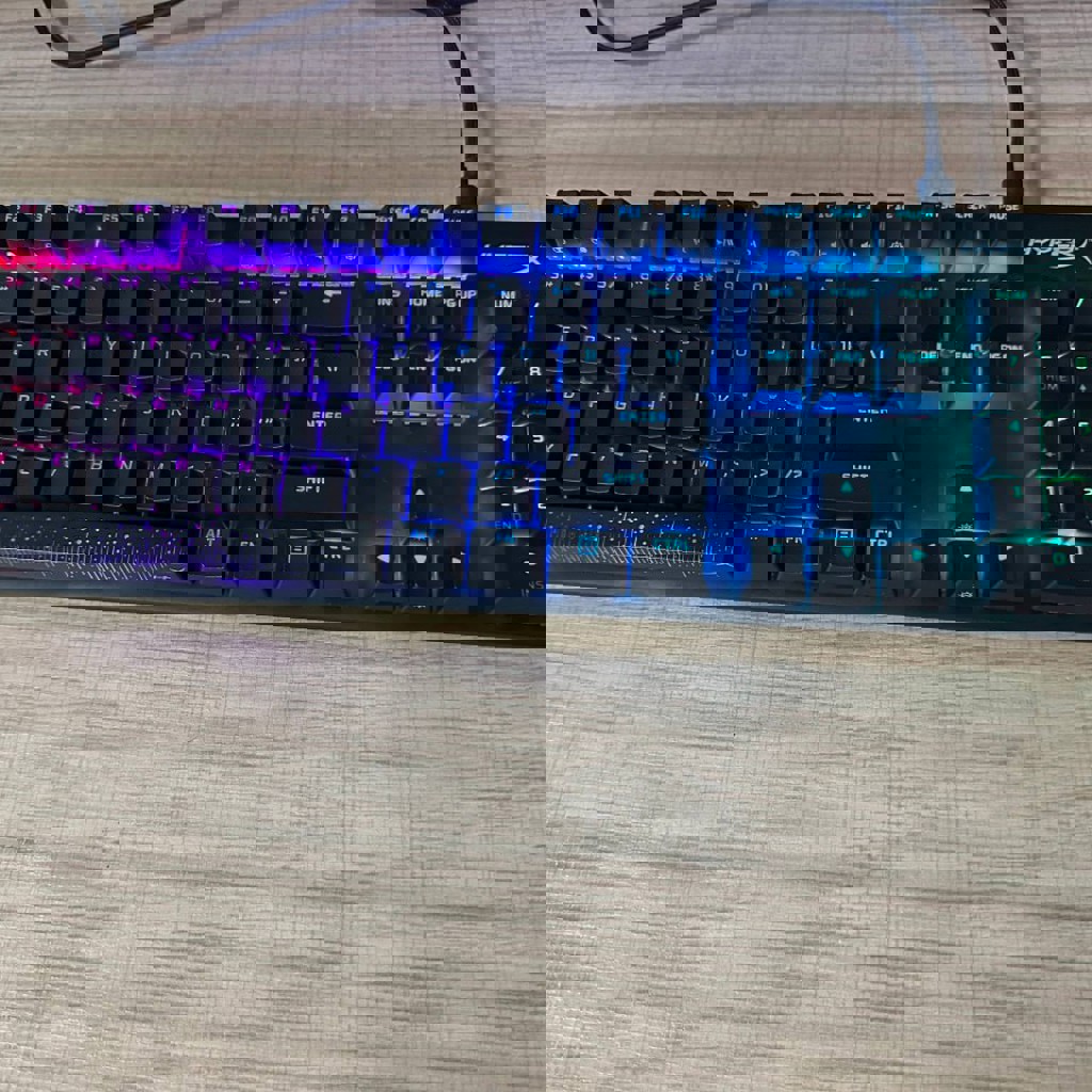 Полноразмерная клавиатура с красными свичами, RGB-подсветкой и английской раскладкой. В магазине цена — 269 лар. В использовании не долго.