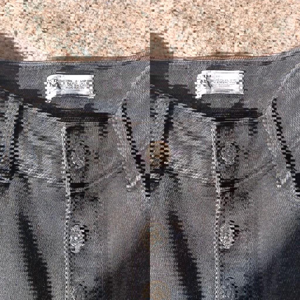 Темно-серые, плотный стрейч. Написано, что XS, но подойдёт на S. Состояние новых. Я переделала клепки-пуговицы на серебристые (были золотые).