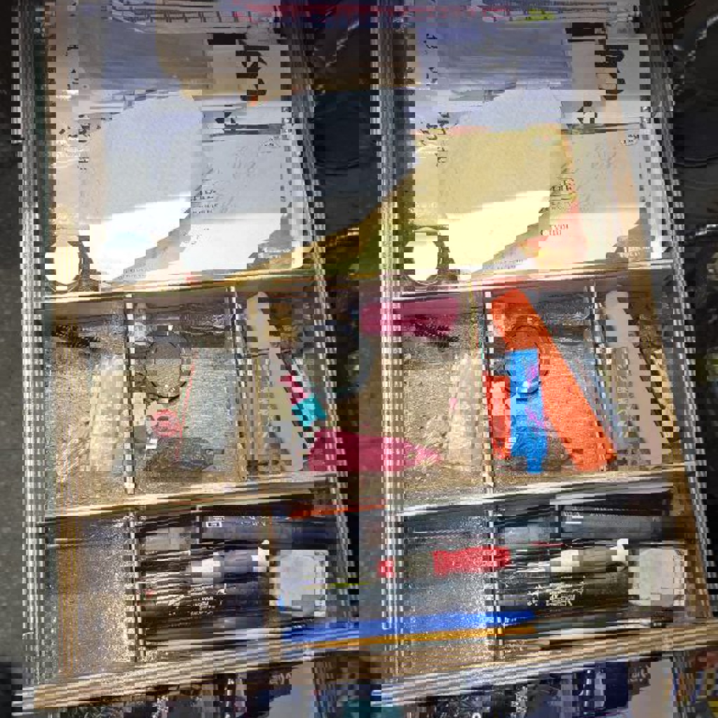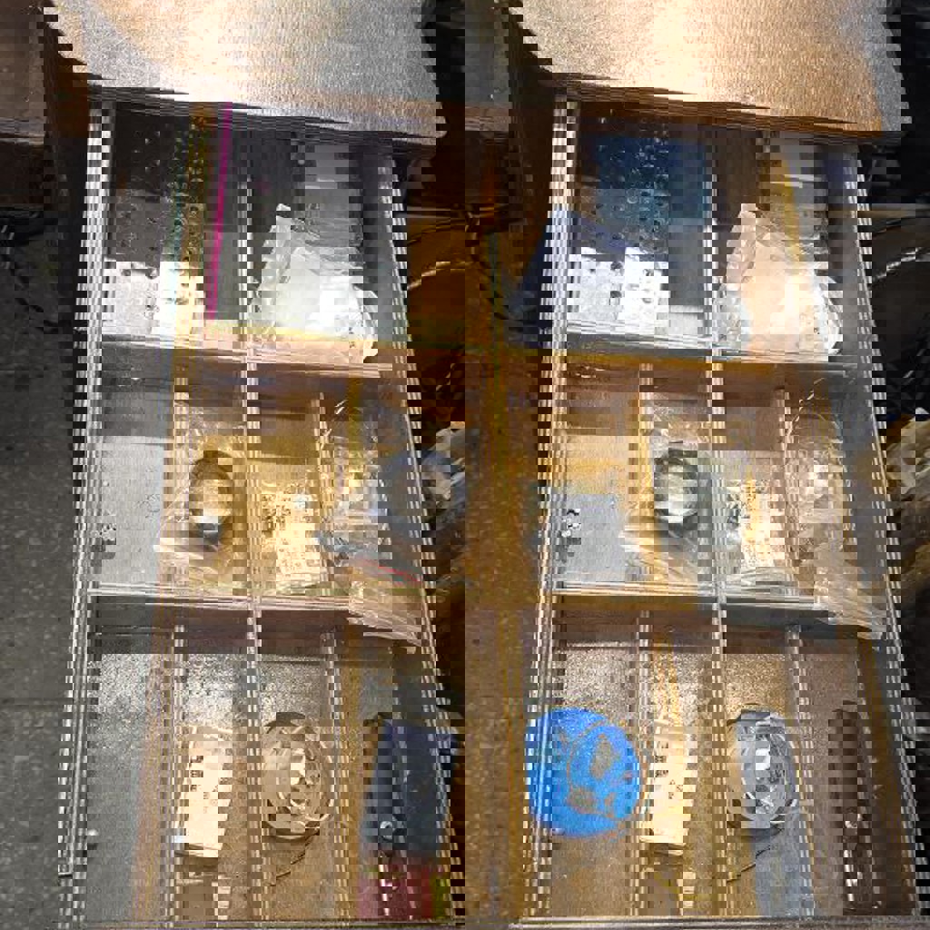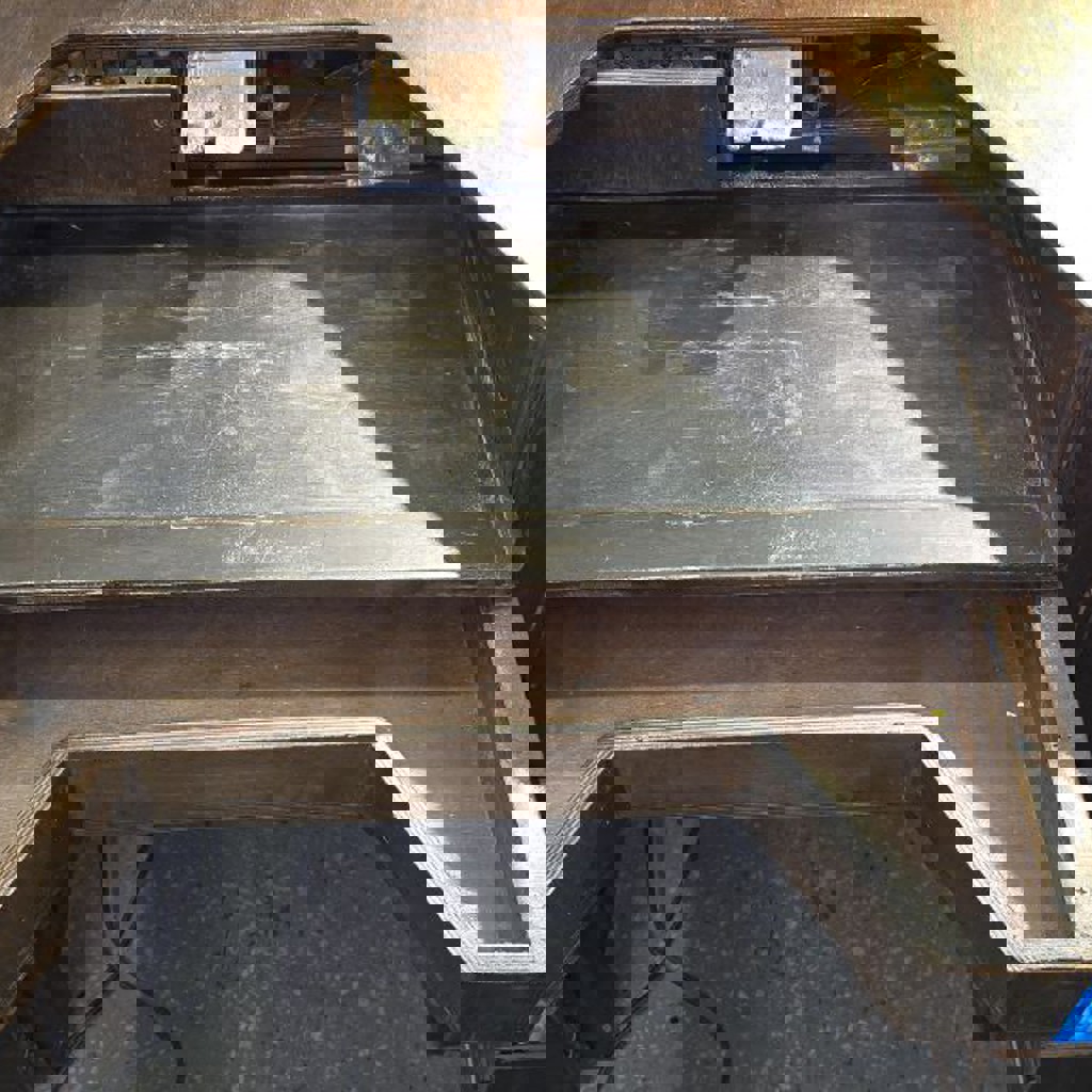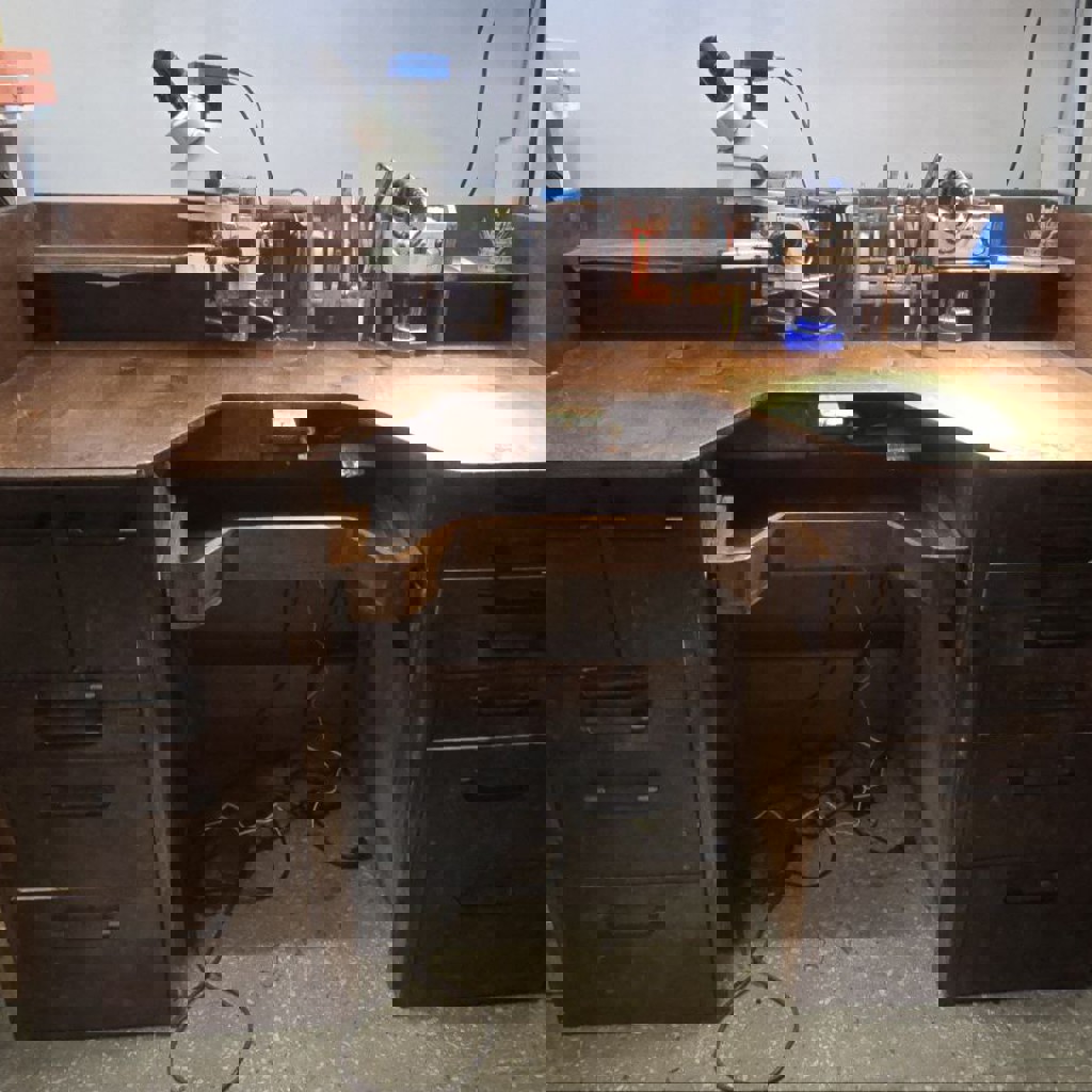 Ювелирный верстак 153*73 см, высота столешницы 86 см. Сделан с учётом опыта предыдущих 5 моделей. Верхние левые ящики с креплениями под штихеля, лобзики, циркули. Отдельный маленький ящик под боры над поддоном. Полки под инструмент и приспособления. Часть ящиков с перегородками для мелочей, пролита лаком. Нижняя зона хранения для крупных вещей и расходников. Покрыт яхтным лаком. Массивная конструкция.