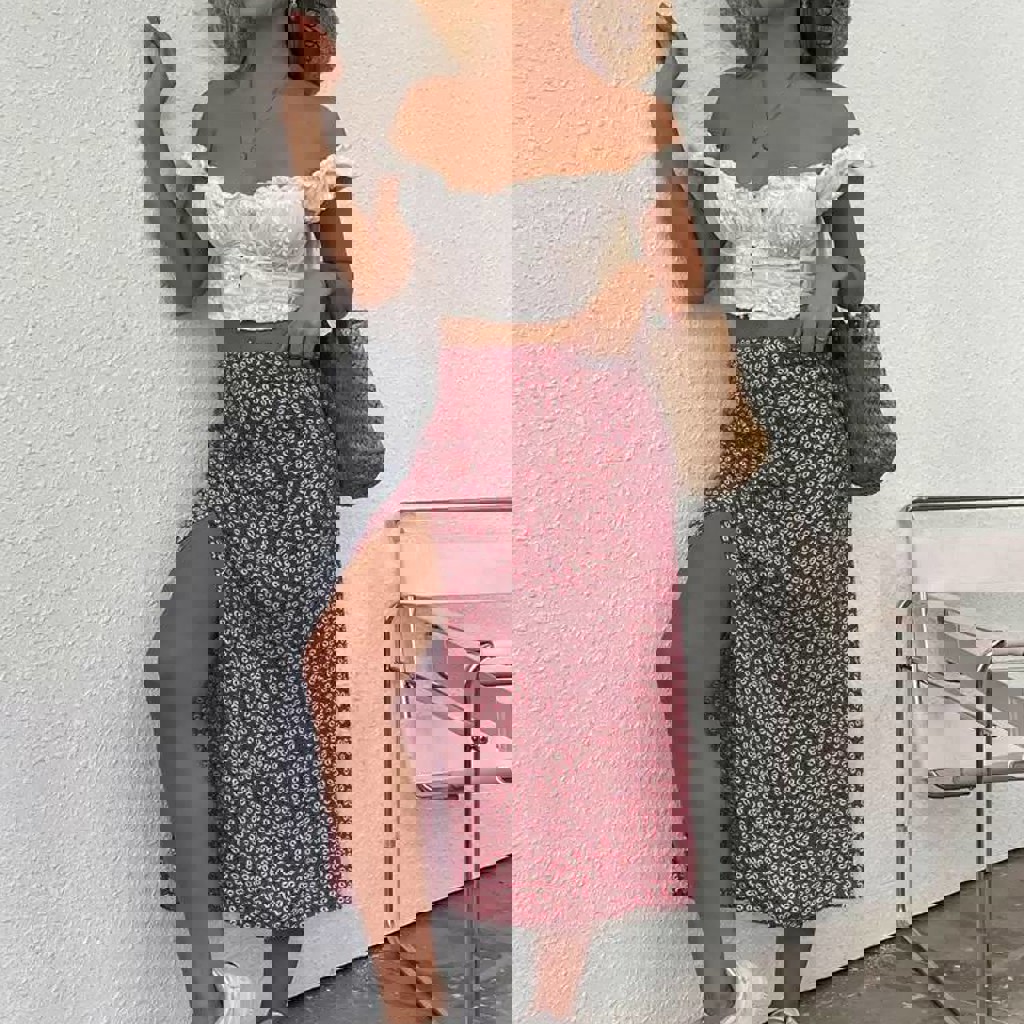 Яркая юбка из вискозы с разрезом по ноге. Размер M на бирке, длина 79 см, ПТ 36 см (подойдет на S). Новая, цвет розово-красный с белыми цветами, сзади небольшая скрытая молния.