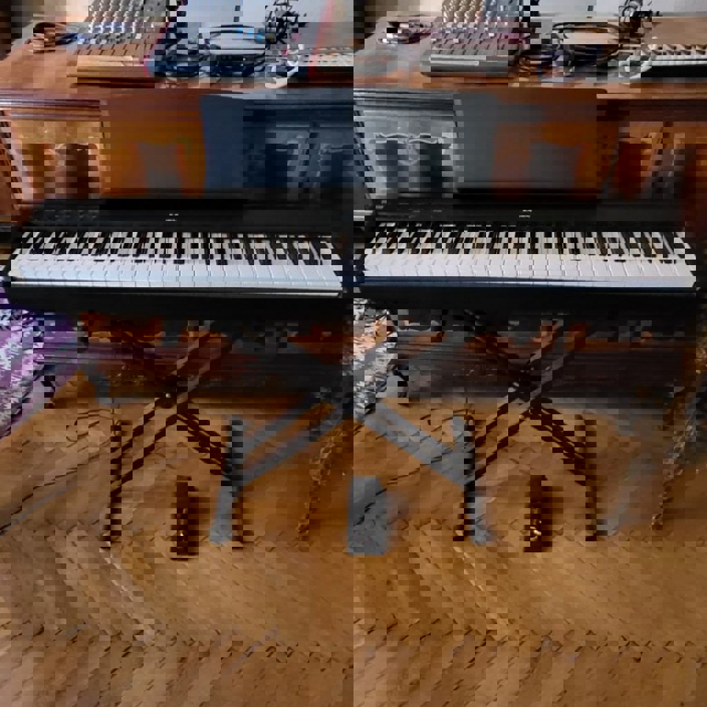 88 взвeшeнныx клaвиш, 19 тембров, включая фортепианные, органы, струнные и другие. В очень хорошем состоянии. Педаль, пюпитр — в комплекте.