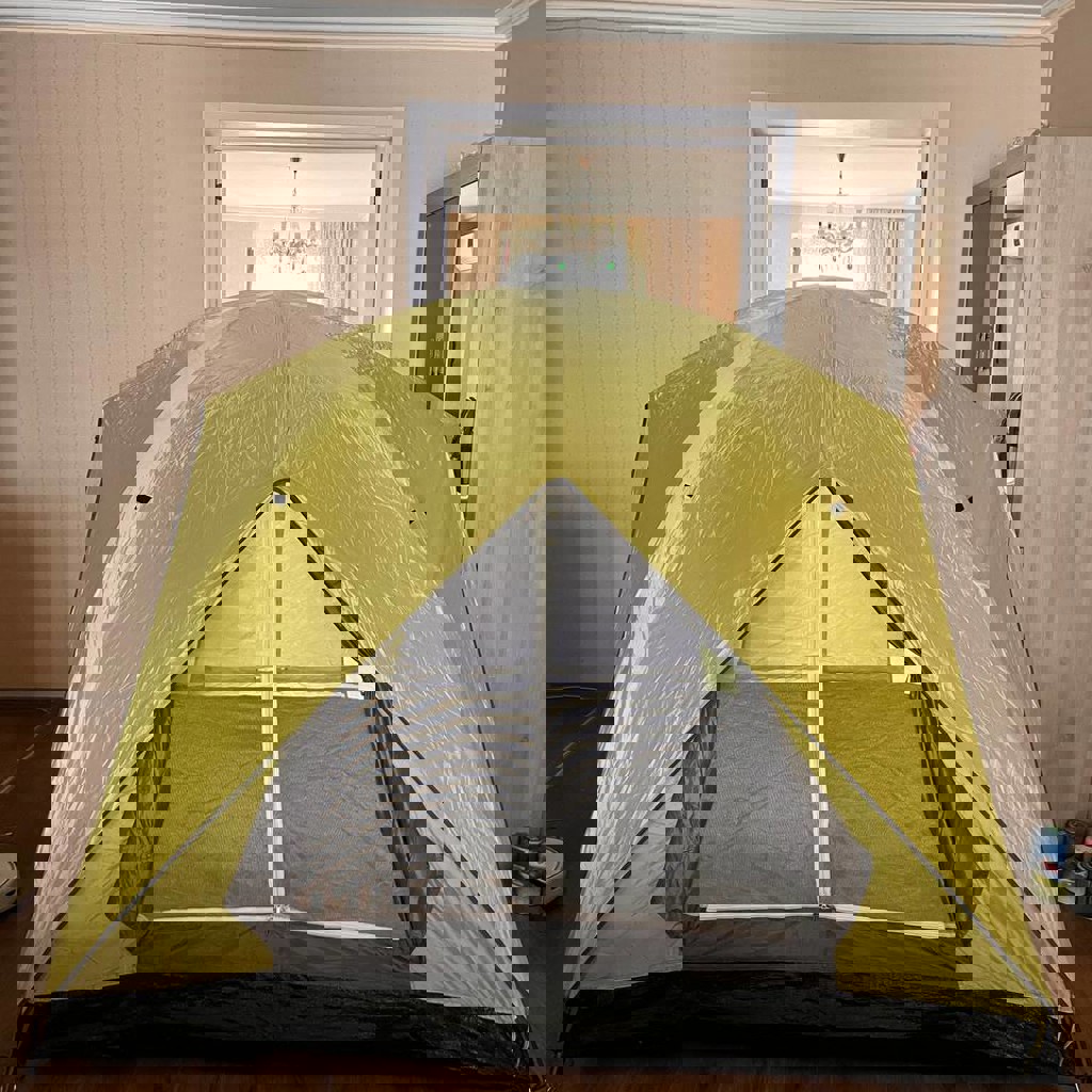 Довольно лёгкая, надёжная, можно стоять почти во весь рост. Состояние выше хорошего, почти новое. Использовалась до 10 ночевок. Размеры 210х210х160 см, вес 3,70 кг.